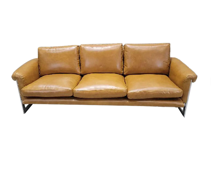 Mid Century Modern Milo Baughman Style Chrome Flat Bar Sofa Newly Reupholstered in Distressed Leather