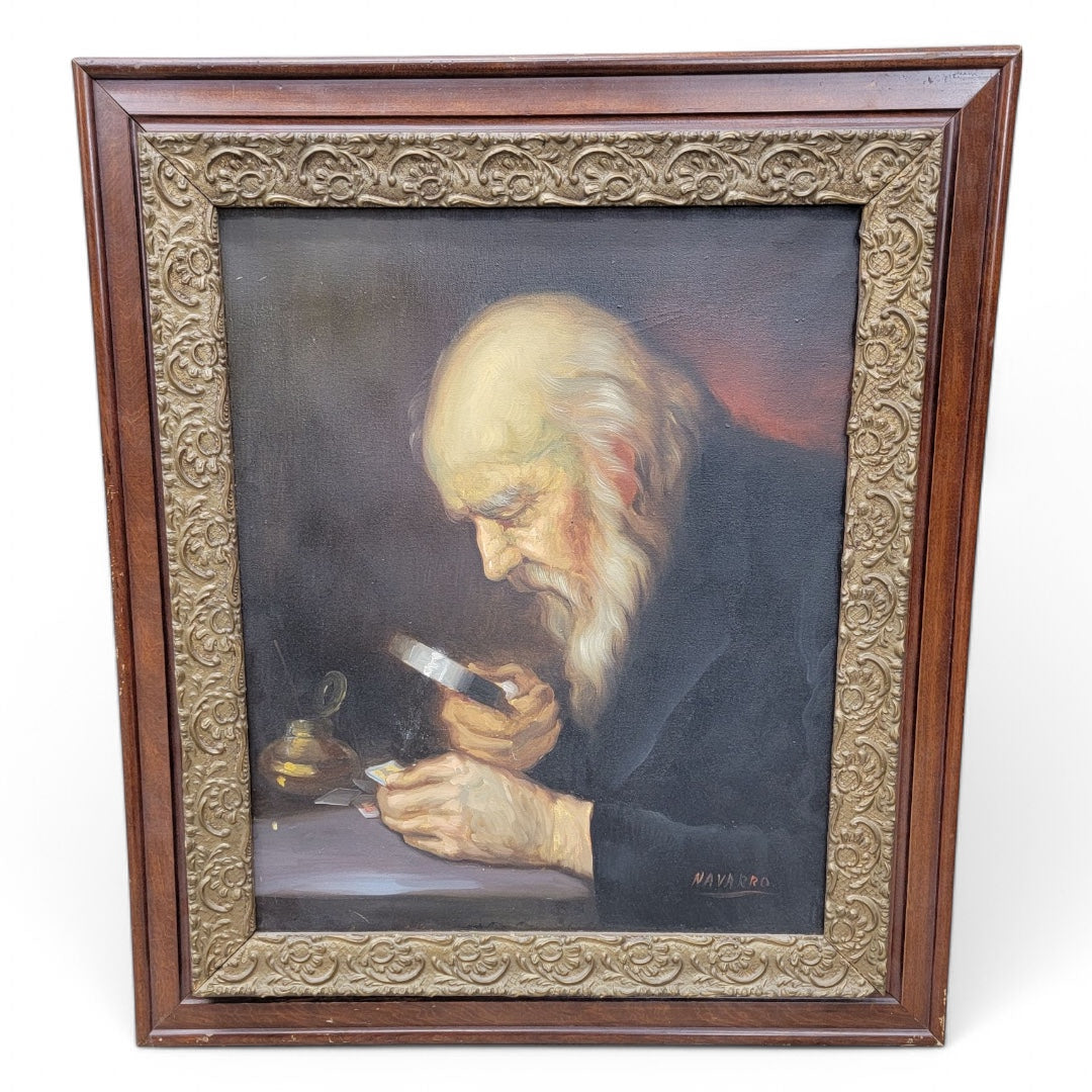 This antique painting titled “The Collector,” signed by Navarro, depicts an elderly, balding man with a long white beard intently examining a small object through a magnifying glass. The artist captures his concentration and character with warm tones and finely rendered detail, giving the piece a strong narrative presence.