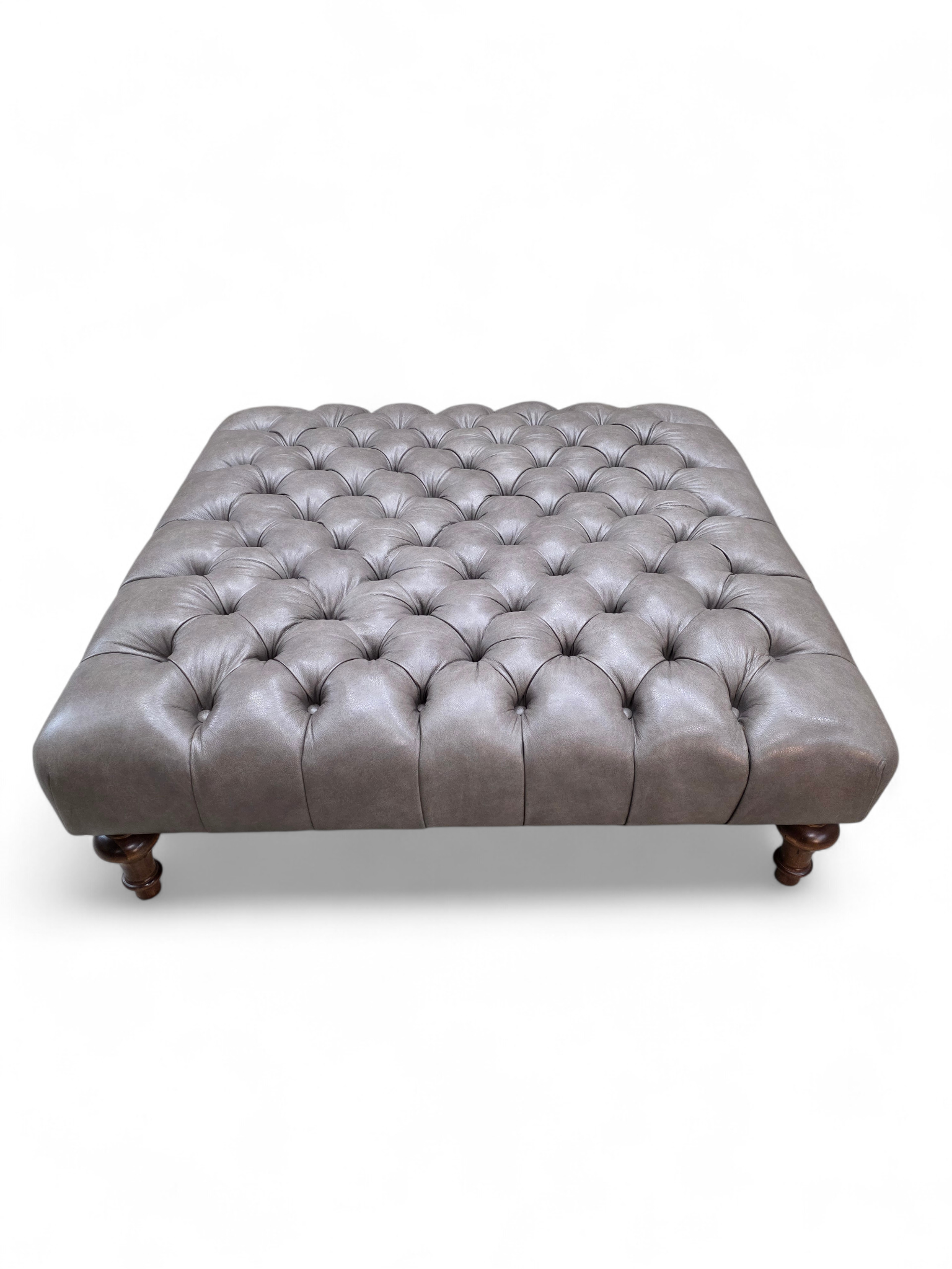 Vintage Chesterfield Style Tufted Gray Leather Ottoman