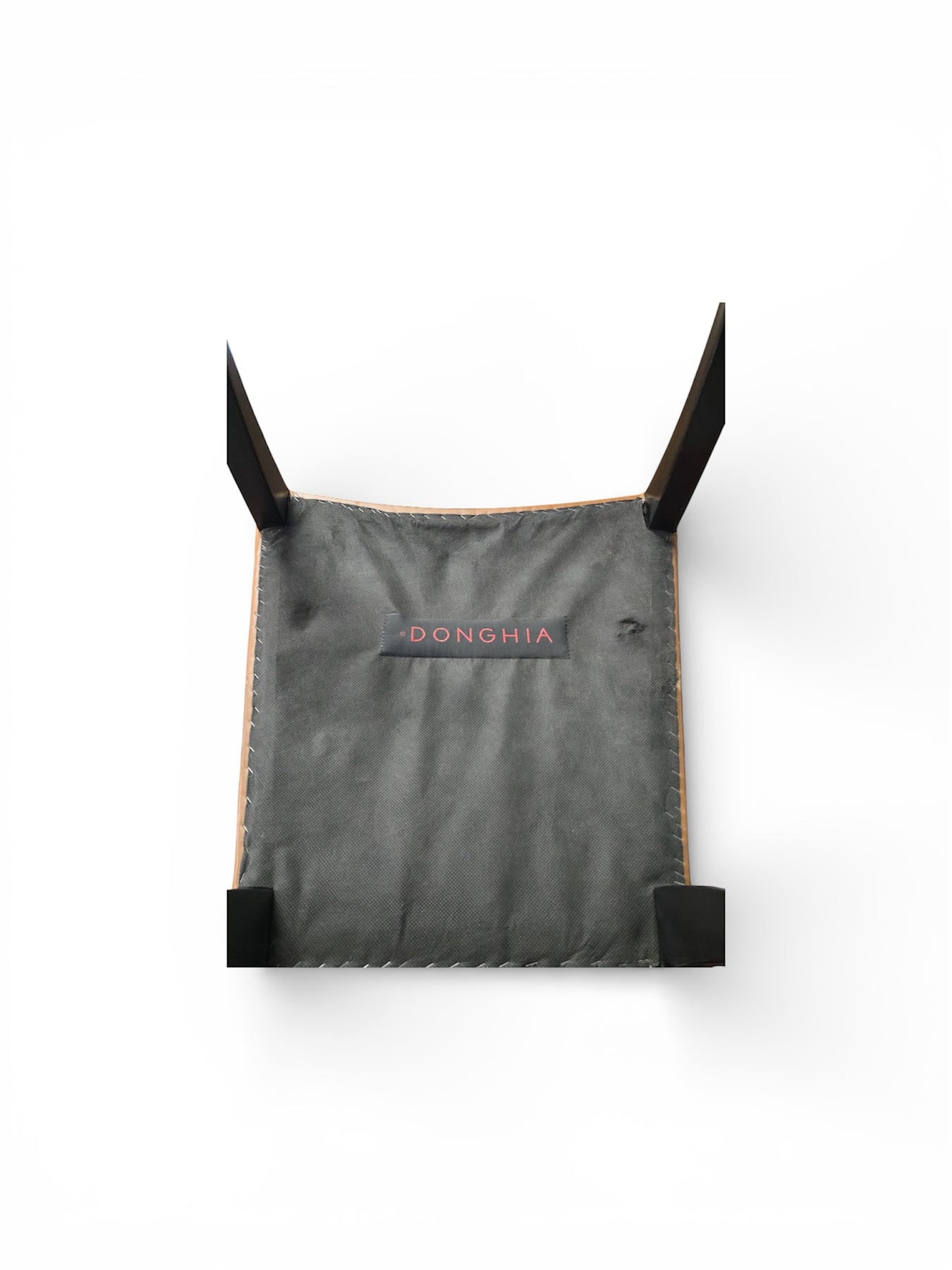 A sculptural set of four vintage armchairs by Donghia, retaining original maker’s tags. These chairs feature a refined serpentine silhouette with inward sweeping arms and a dramatic architectural outer shell.