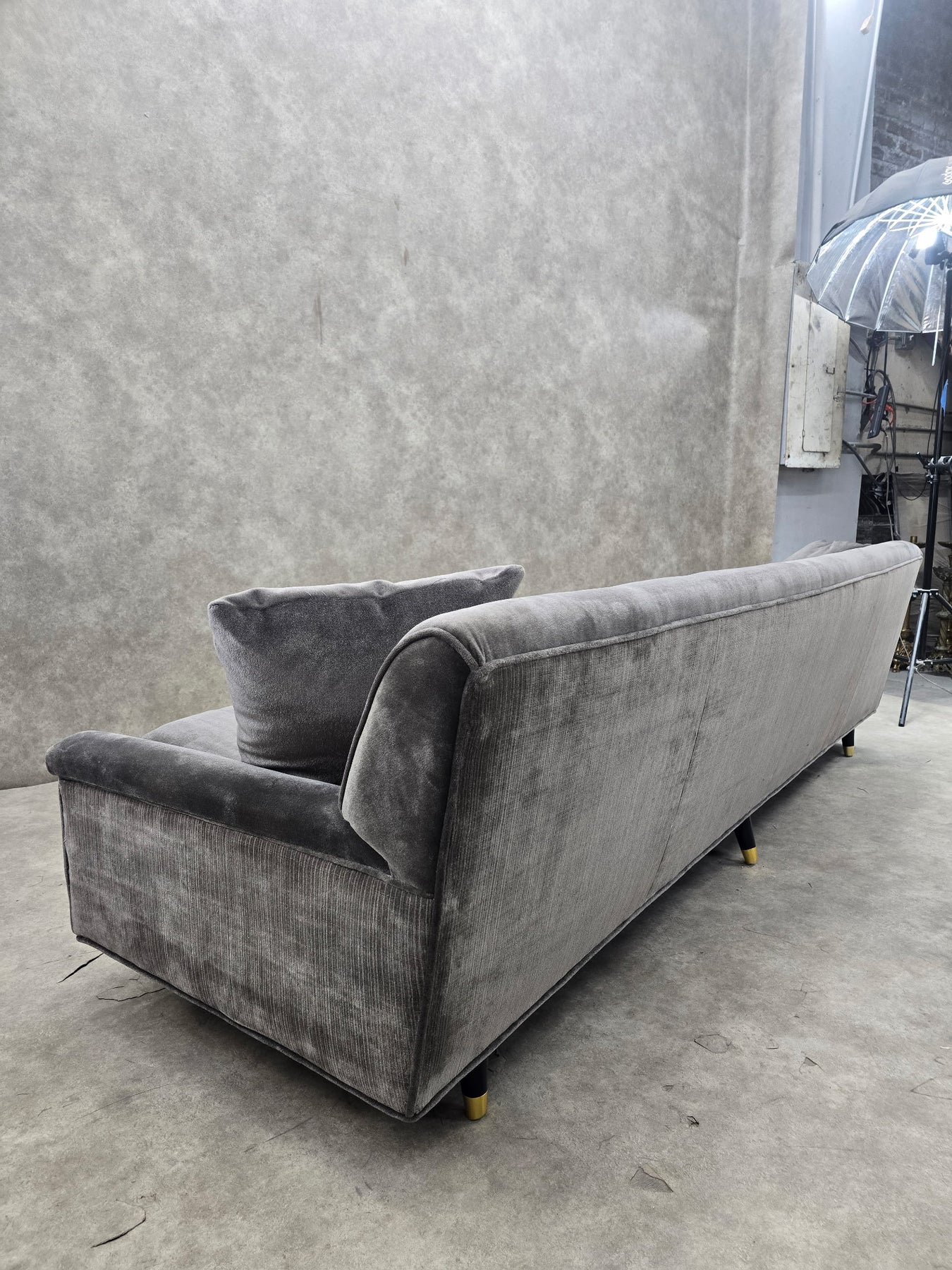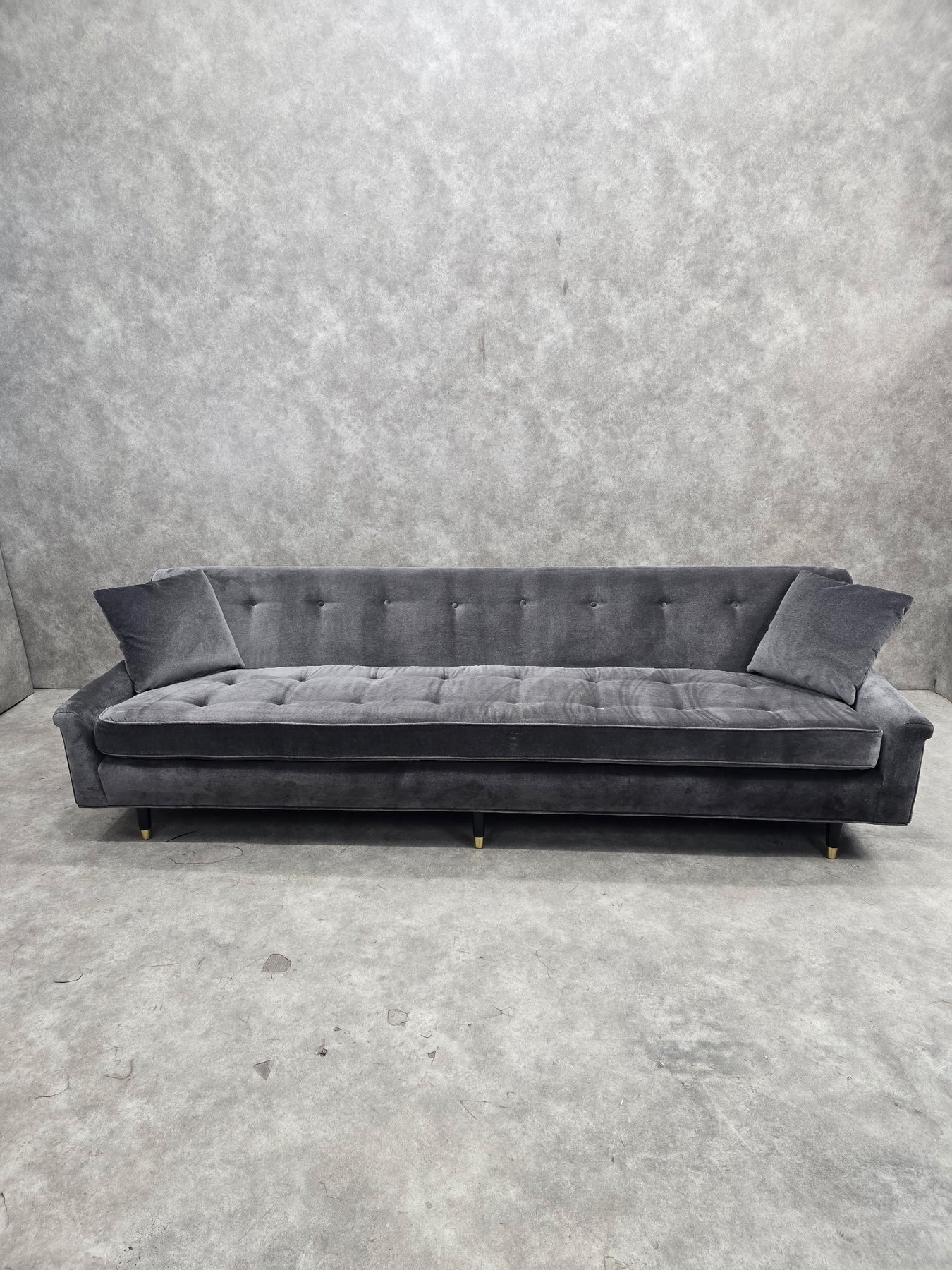 This beautiful, clean lined sofa has been completely restored and newly upholstered in a high end plush "gun-metal" grey silk velvet with matching pattered velvet on the outside arms and back. The foam has been completely replaced with high-end high density foam and memory foam cushion.