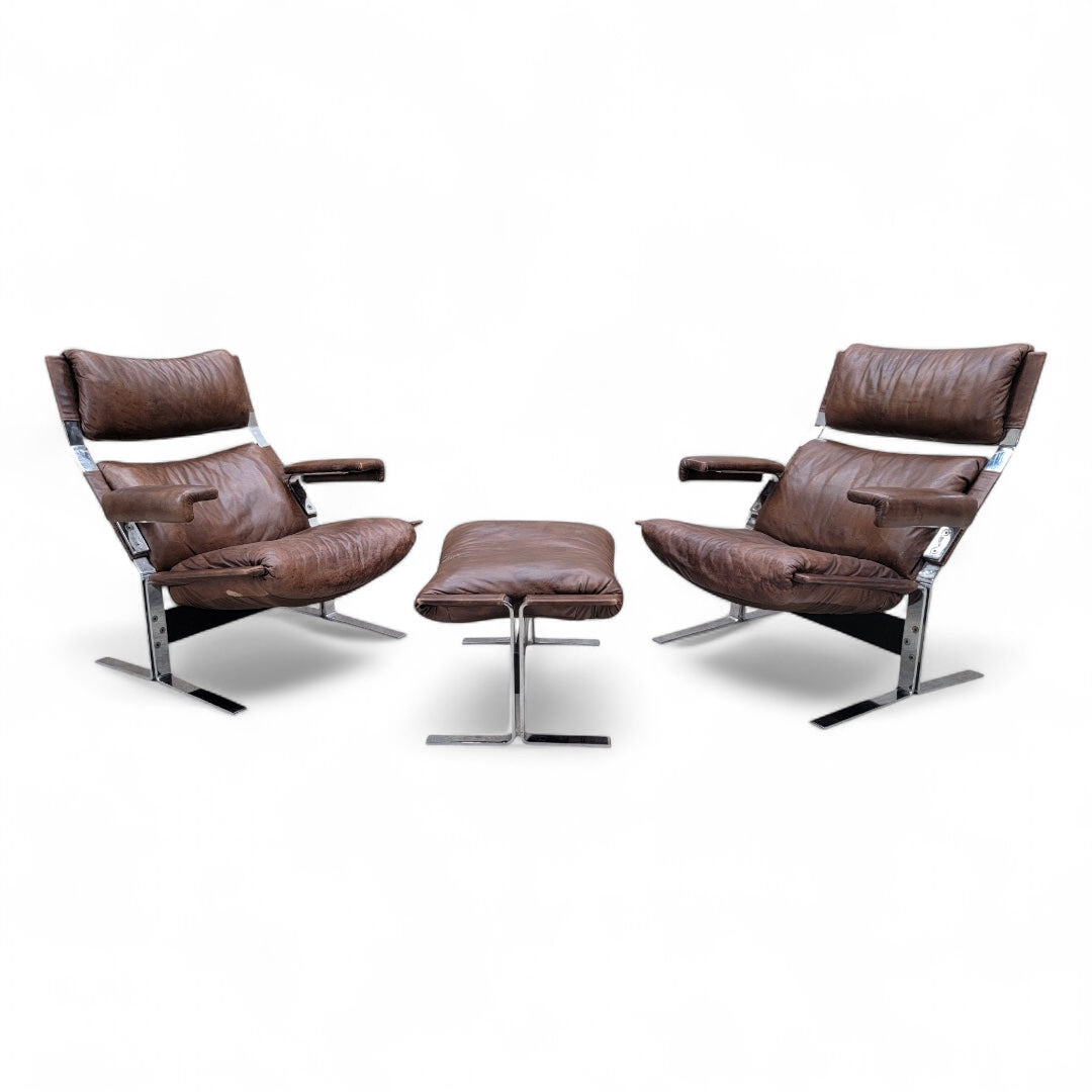 Elevate your living space with this Mid-Century Modern lounge set by Richard Hersberger, featuring two original brown leather chairs and a matching ottoman. The chairs showcase sleek chromium frames paired with rich, supple leather, exemplifying classic mid-century design and craftsmanship. Perfect for living rooms, offices, or modern interiors, this set combines comfort, style, and timeless elegance.
