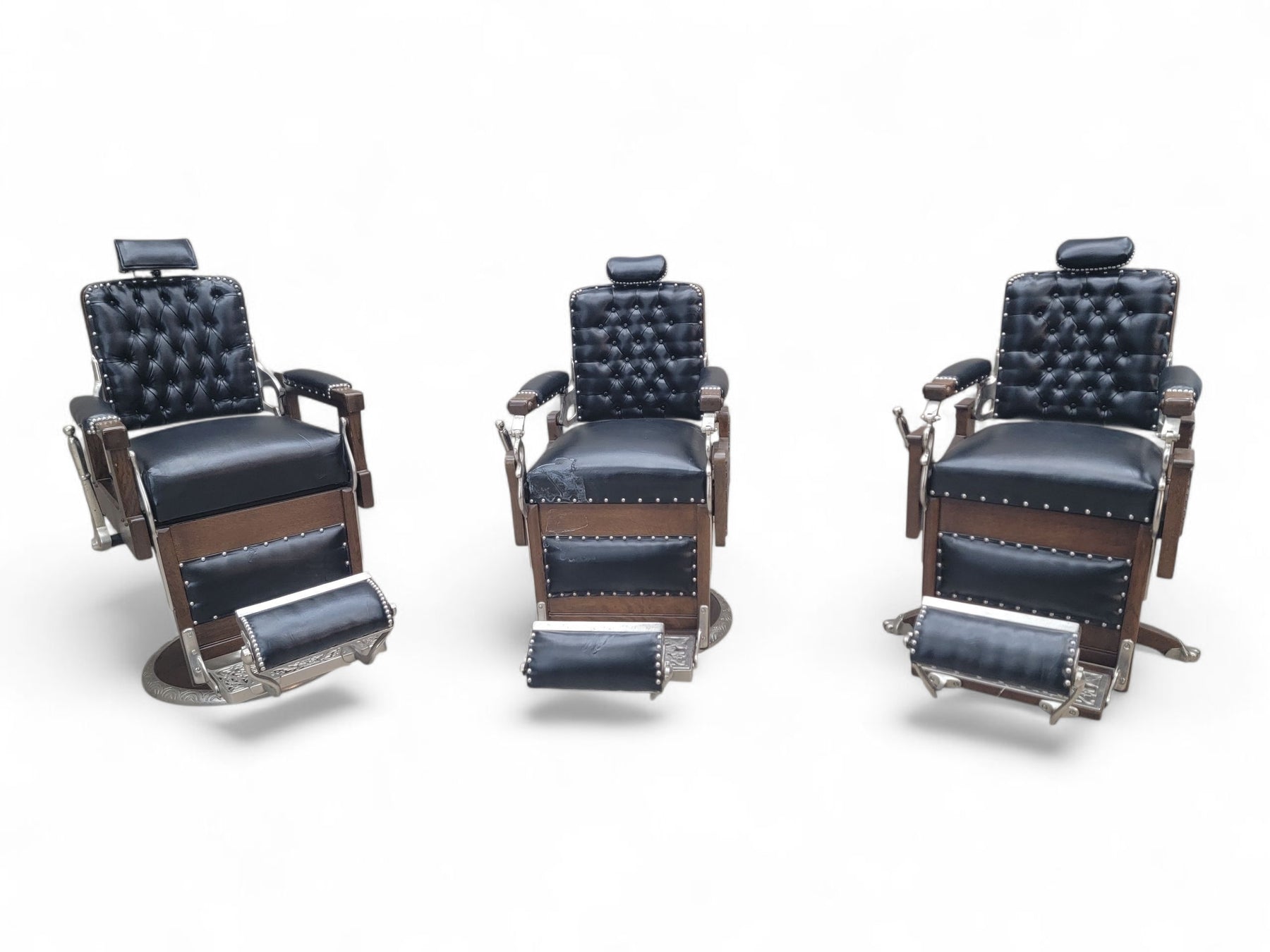 With their substantial presence, intricate wood carving, and fully functional design, these chairs are ideal for a high-end barbershop, grooming lounge, retail display, or private collection.