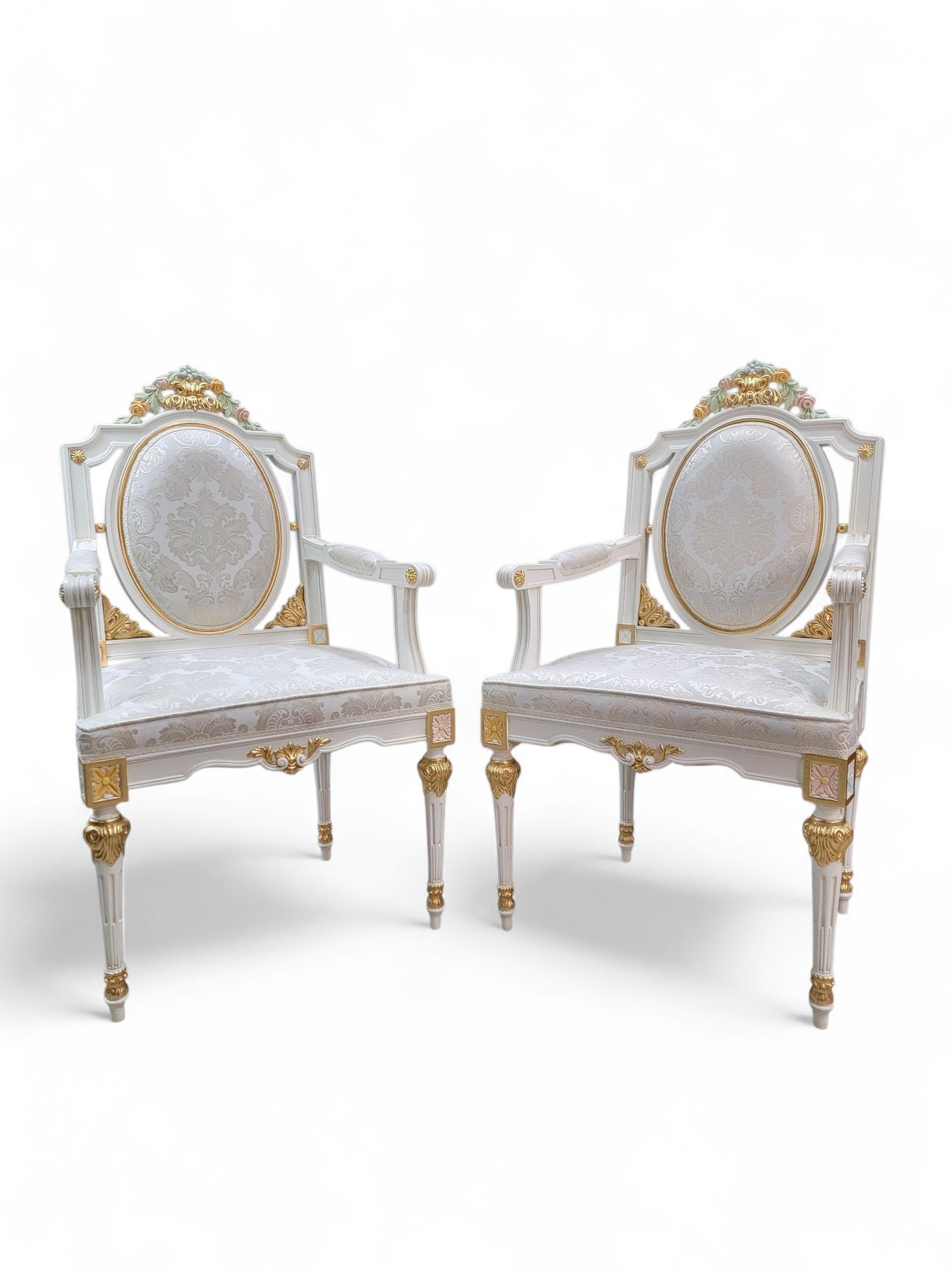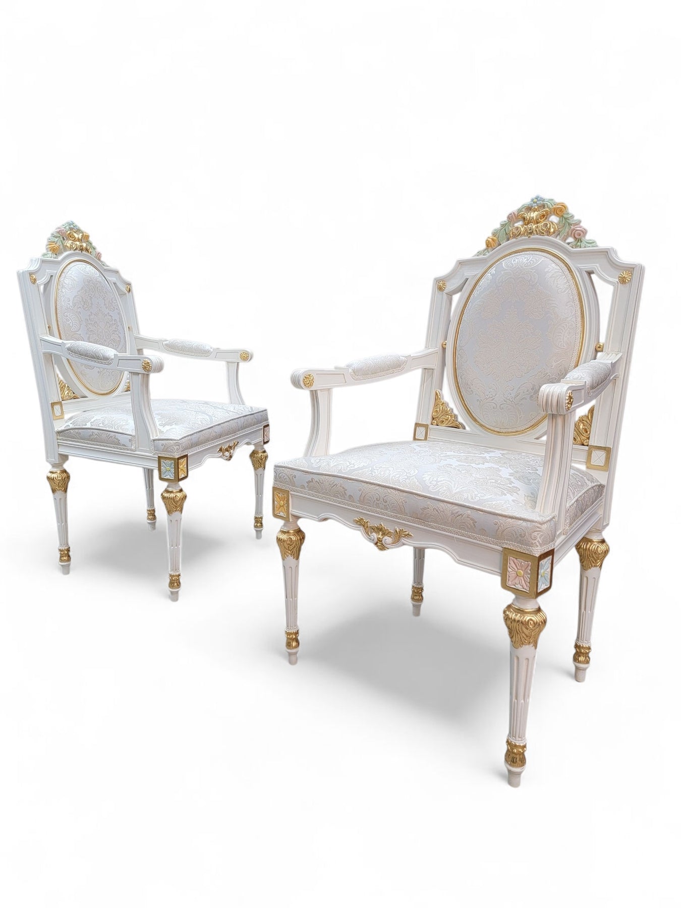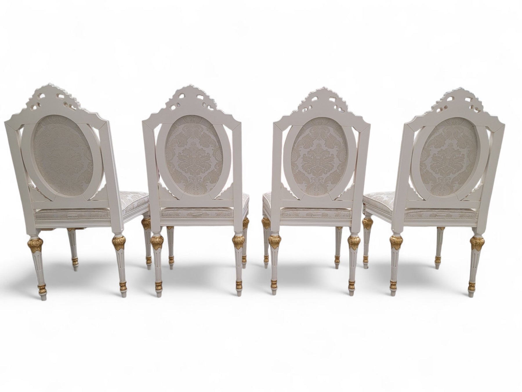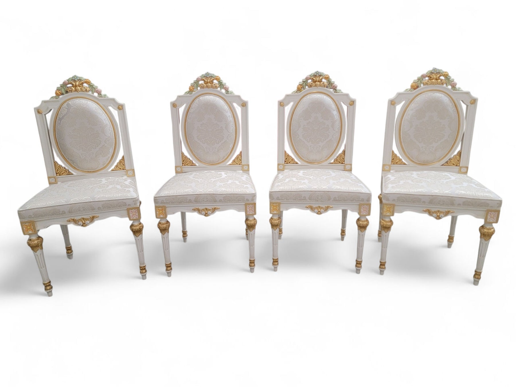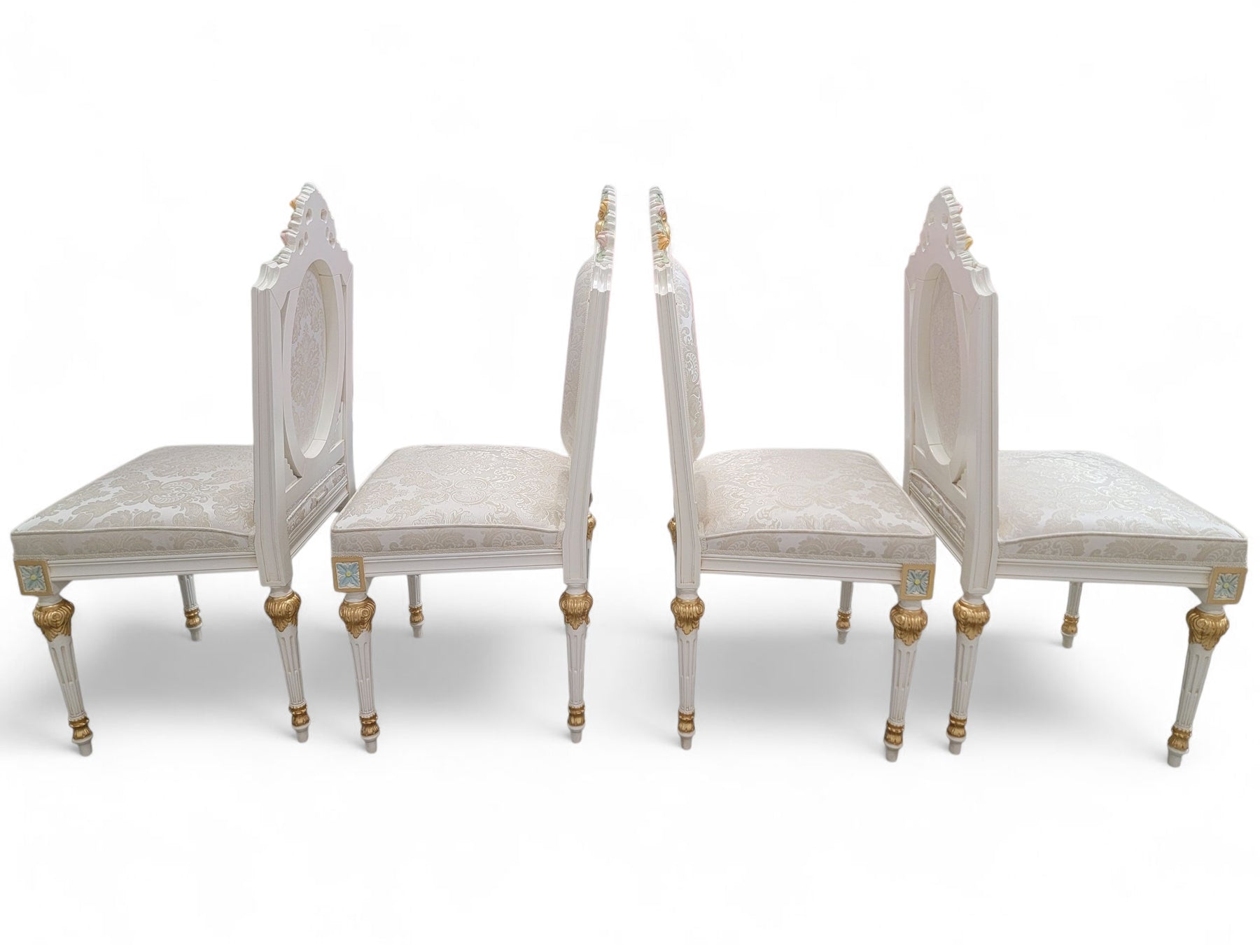 Included are 20 matching custom-made chairs, each crafted in Italy with the same commitment to detail. The gilded carved frames echo the table’s Rococo styling, creating a harmonious, regal presence throughout. The set offers comfortable seating for large gatherings and is ideal for estate dining rooms, luxury interiors, event spaces, or hospitality environments seeking a statement piece with European pedigree.