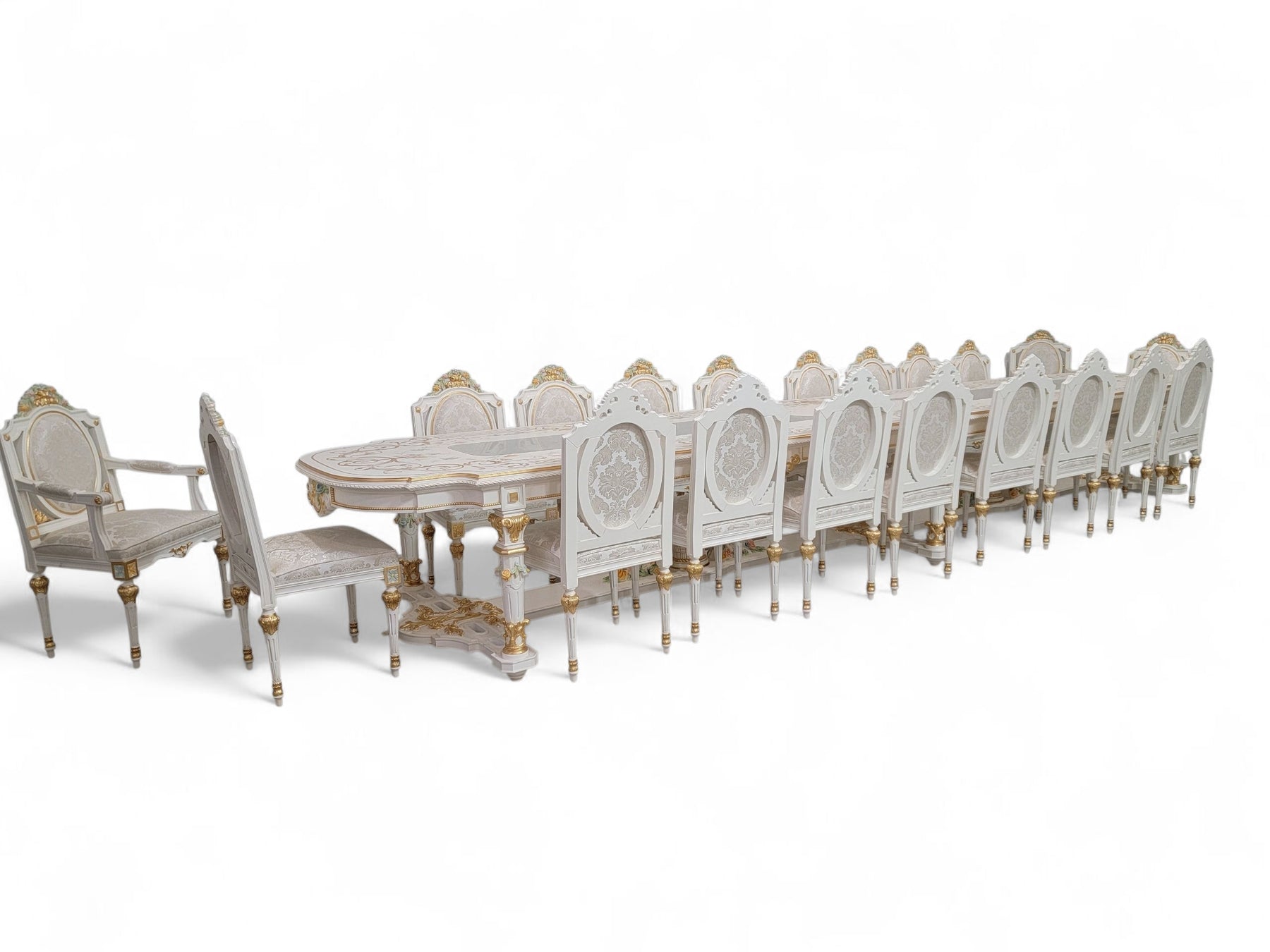 Bring unmatched grandeur and European artistry into your home with this monumental, custom-made-in-Italy, 20-seat Venetian Rococo–style dining set. Designed on a truly spectacular scale, this set is a masterpiece of craftsmanship, luxury, and old-world Italian elegance.