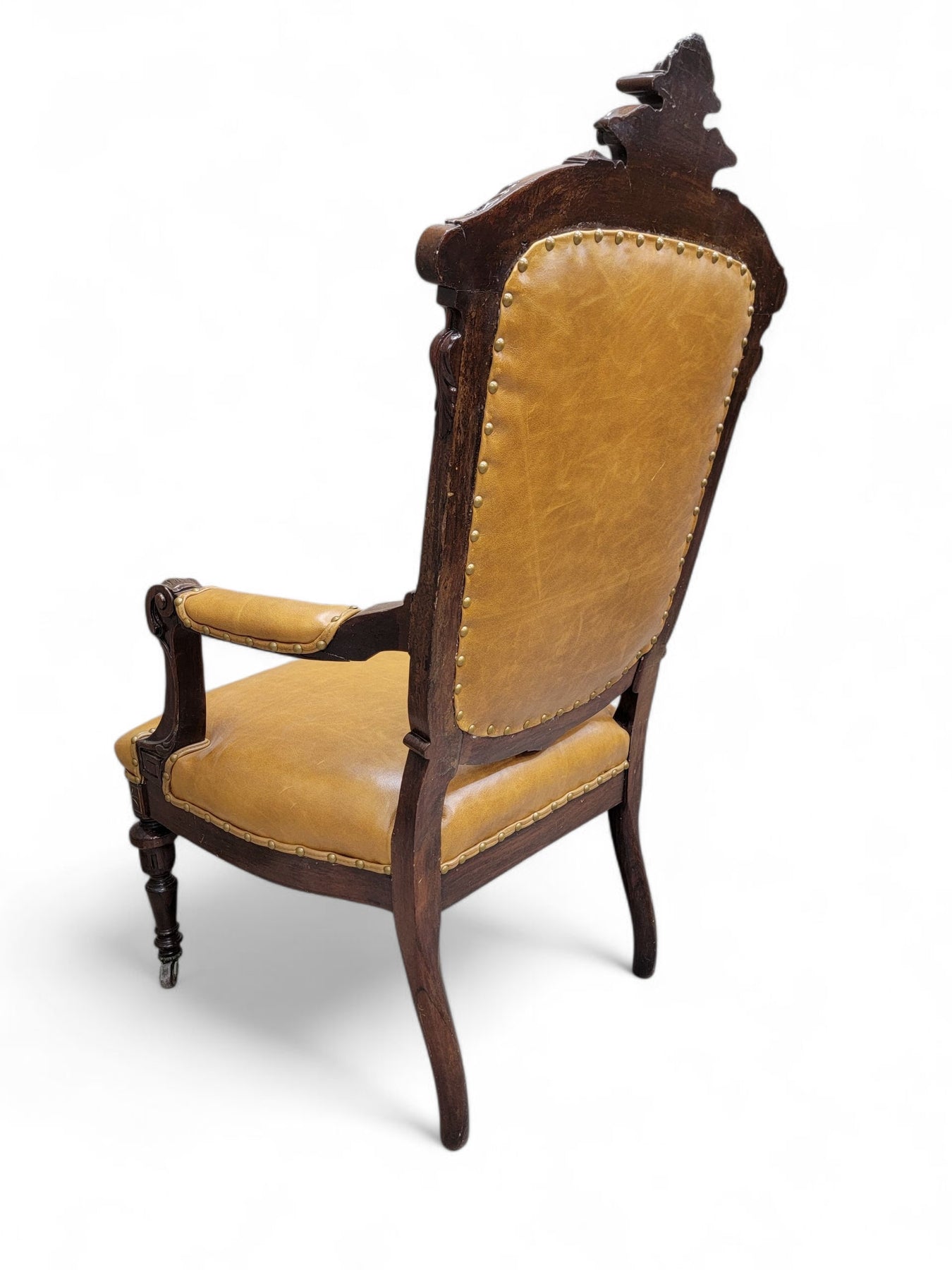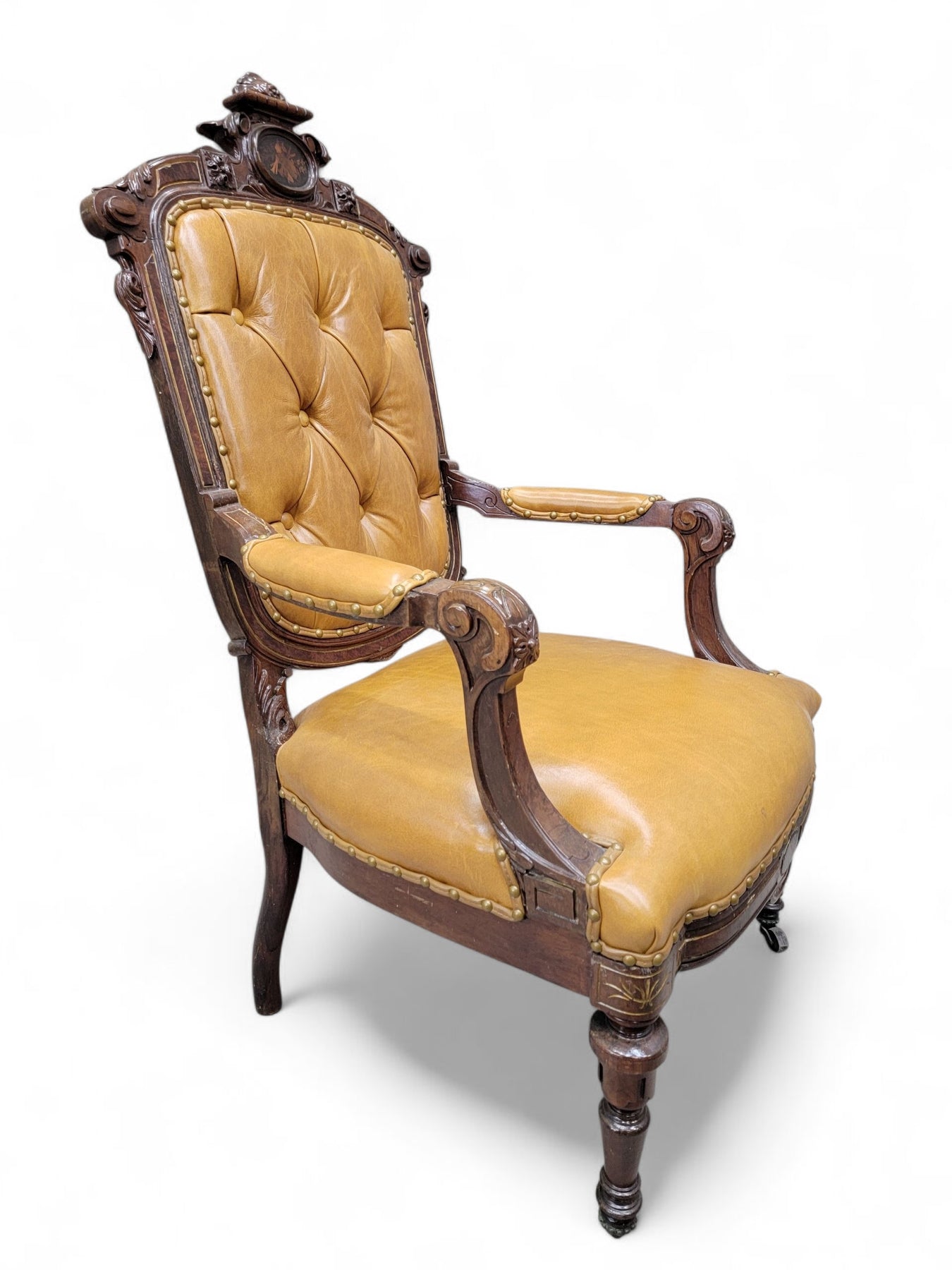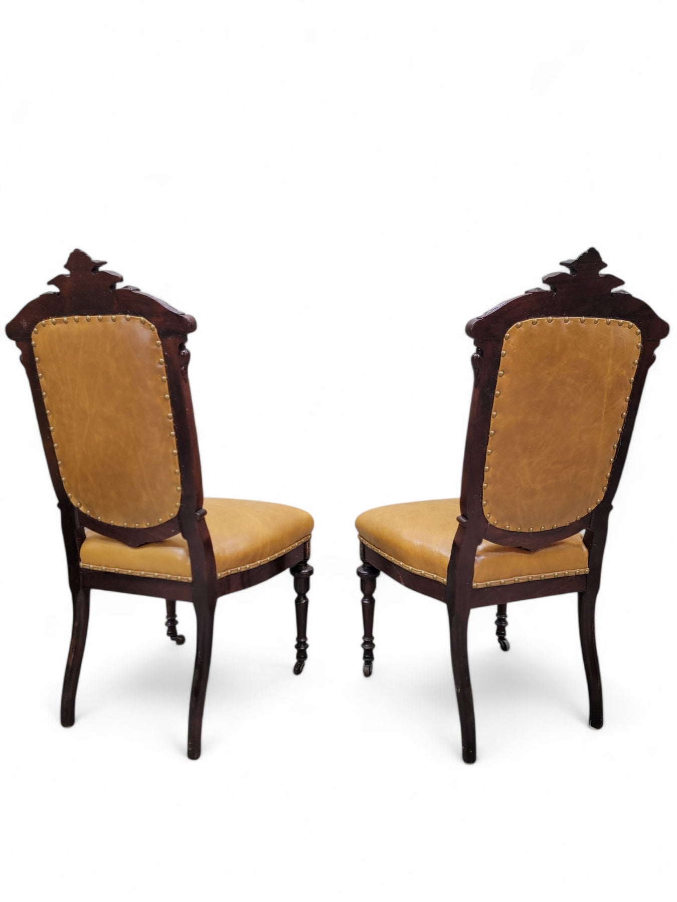 The entire set has been newly reupholstered in supple Italian leather in a warm cognac tone, offering a luxurious and cohesive update while preserving the integrity of the antique design. The tailored tufting enhances comfort and creates a striking contrast against the rosewood frames.