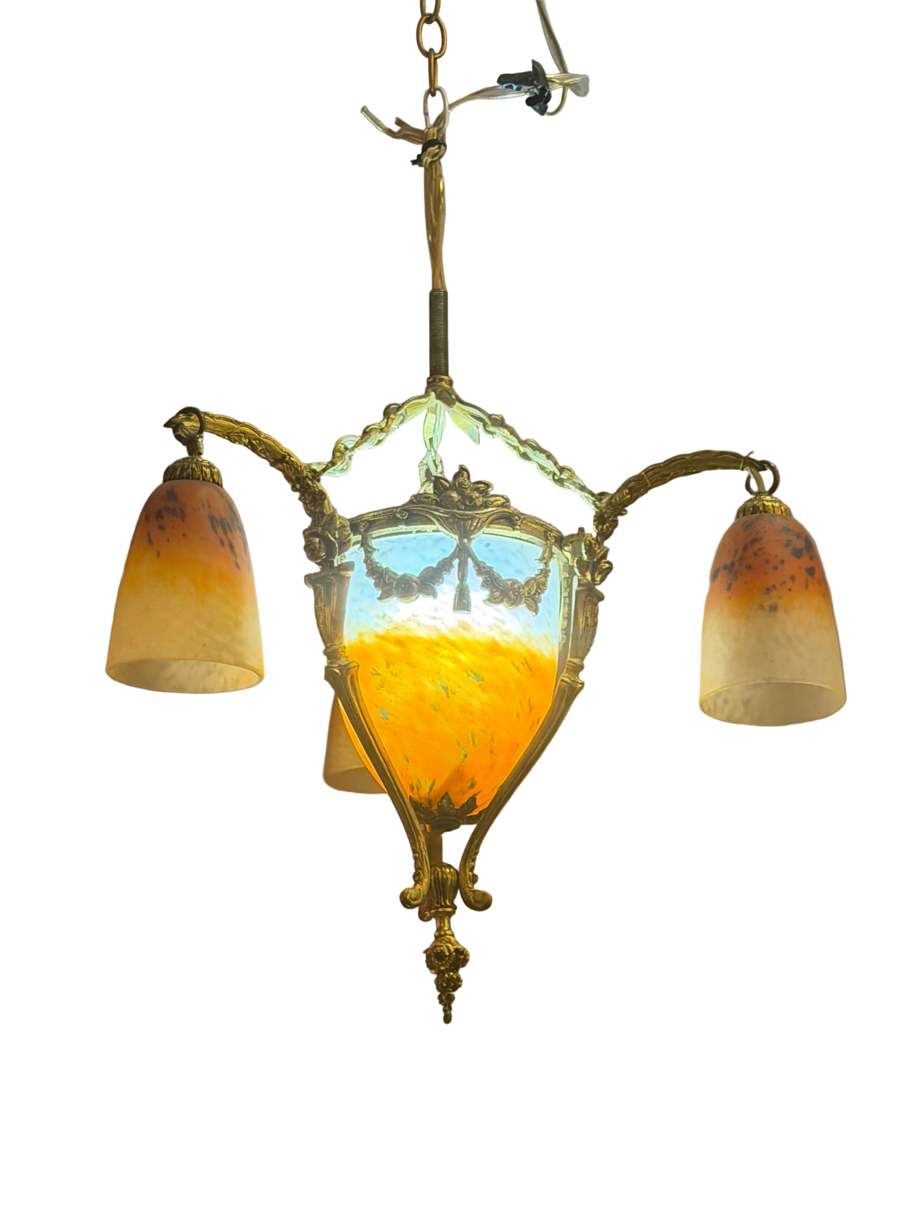Antique Brass Gold Embroidered Silk Shade Crystal Chandelier