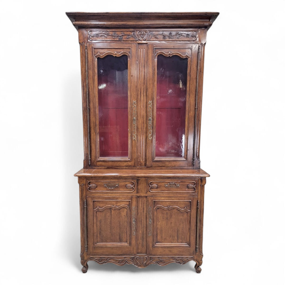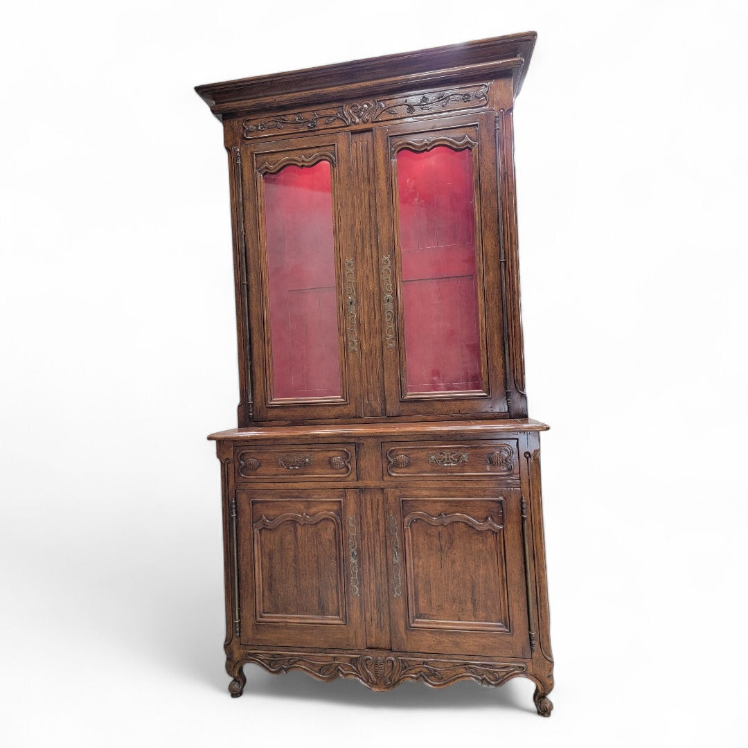 Antique French Provincial Carved Oak 2 Glass Door Display Storage Cabinet Buffet