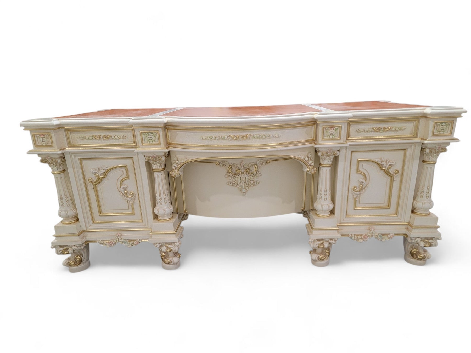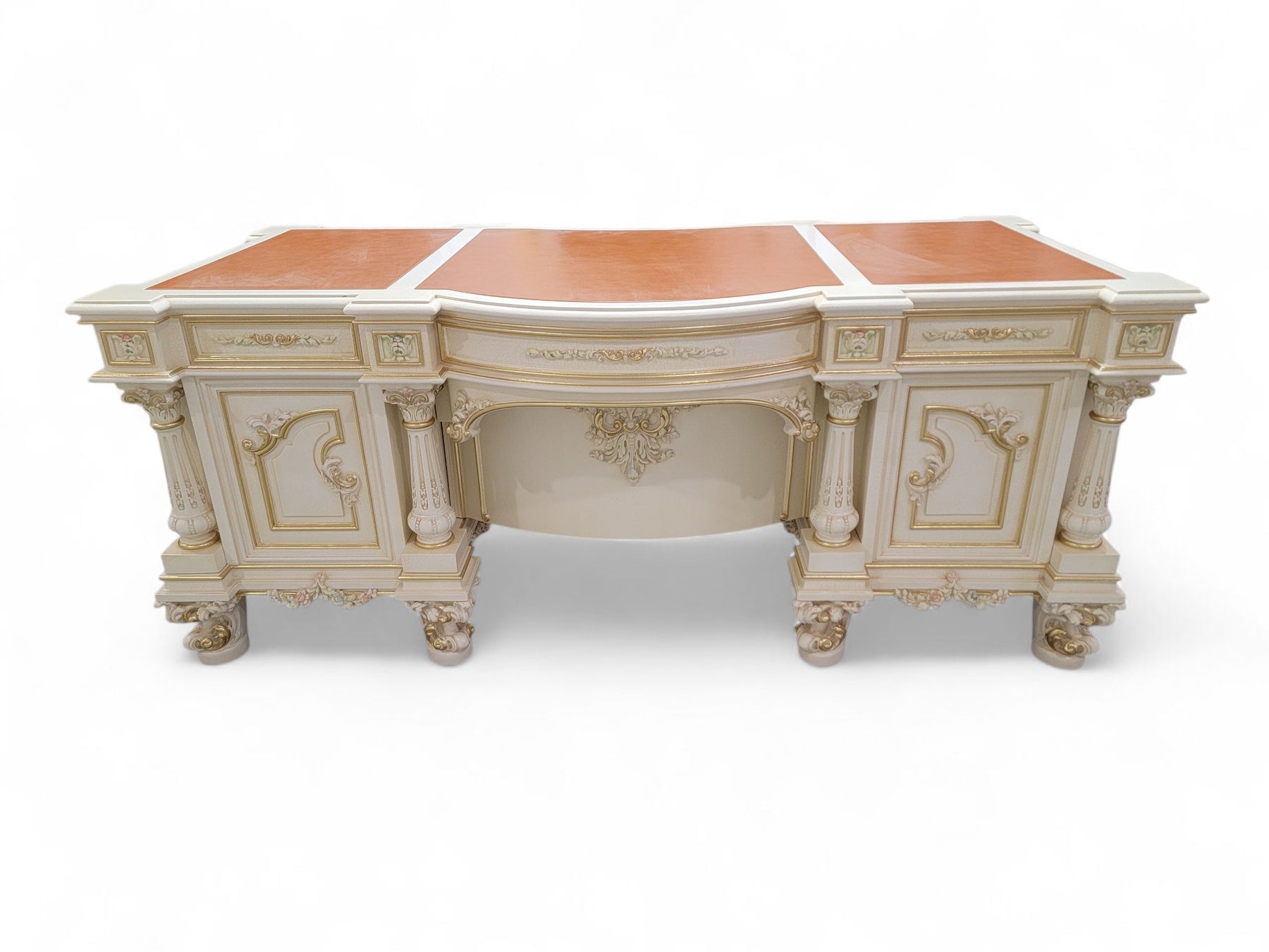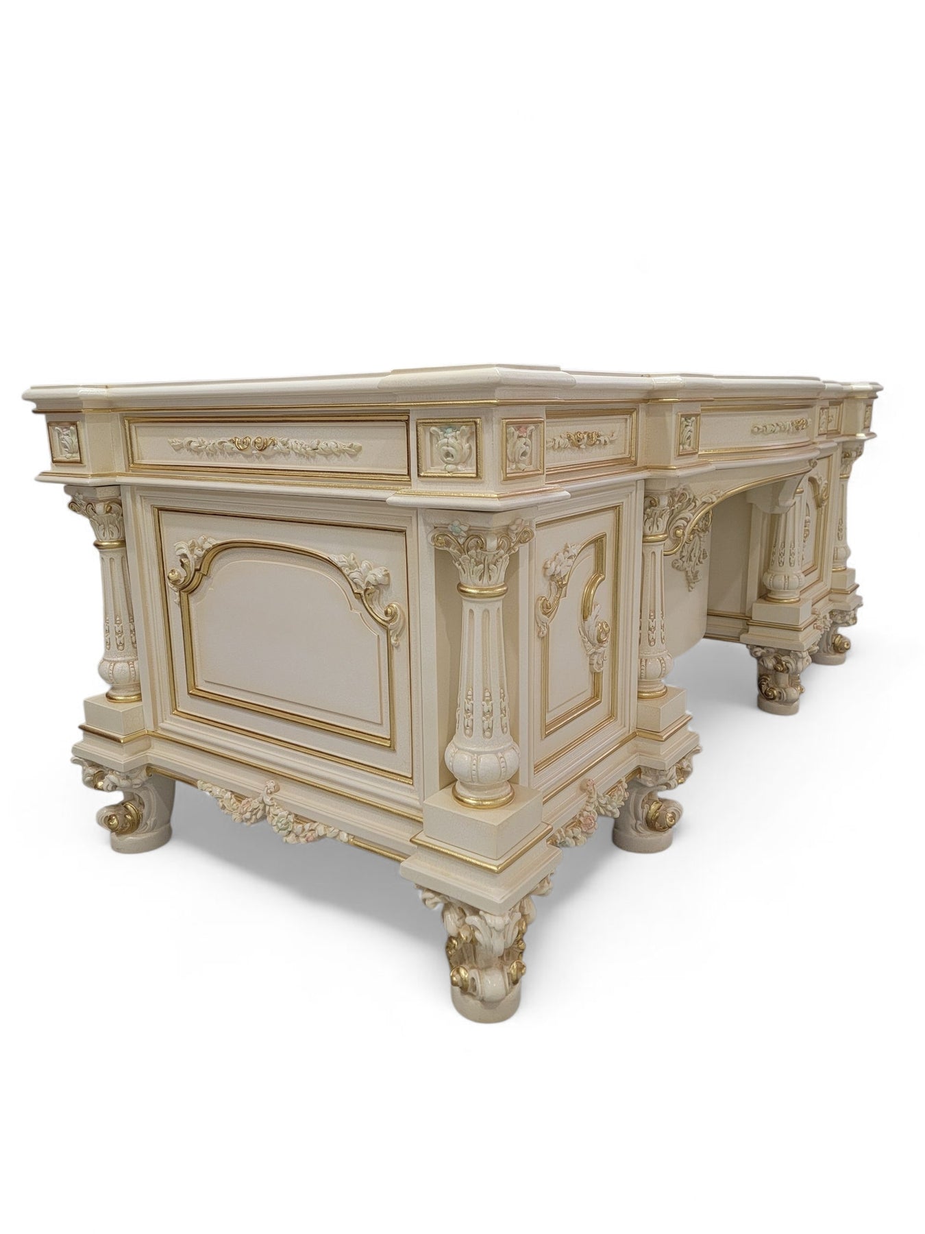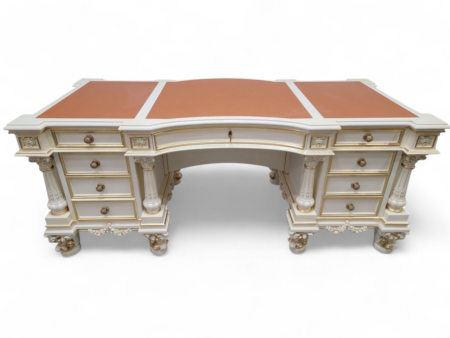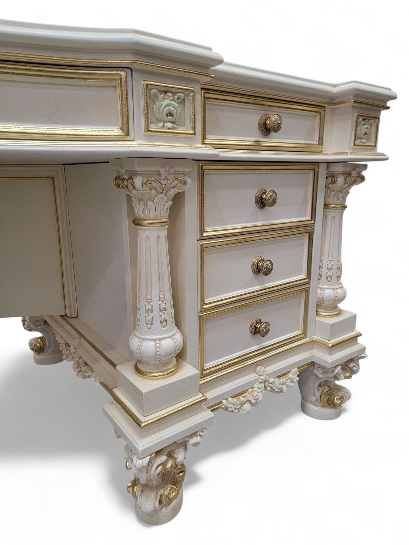 Vintage Custom Venetian Antique Rococo Style Antique White Carved Hand Painted with Leather Top 9 Drawer Executive Desk