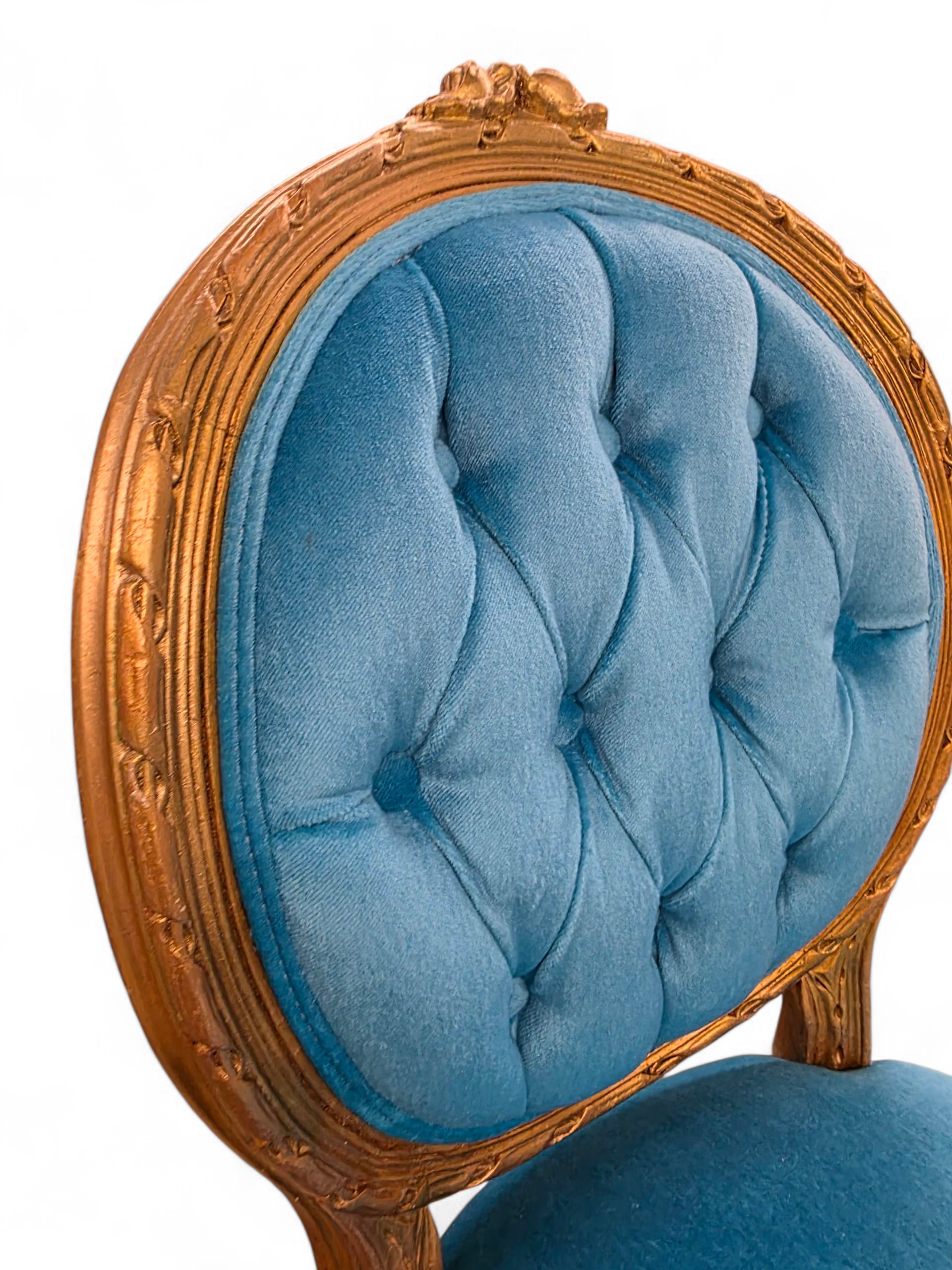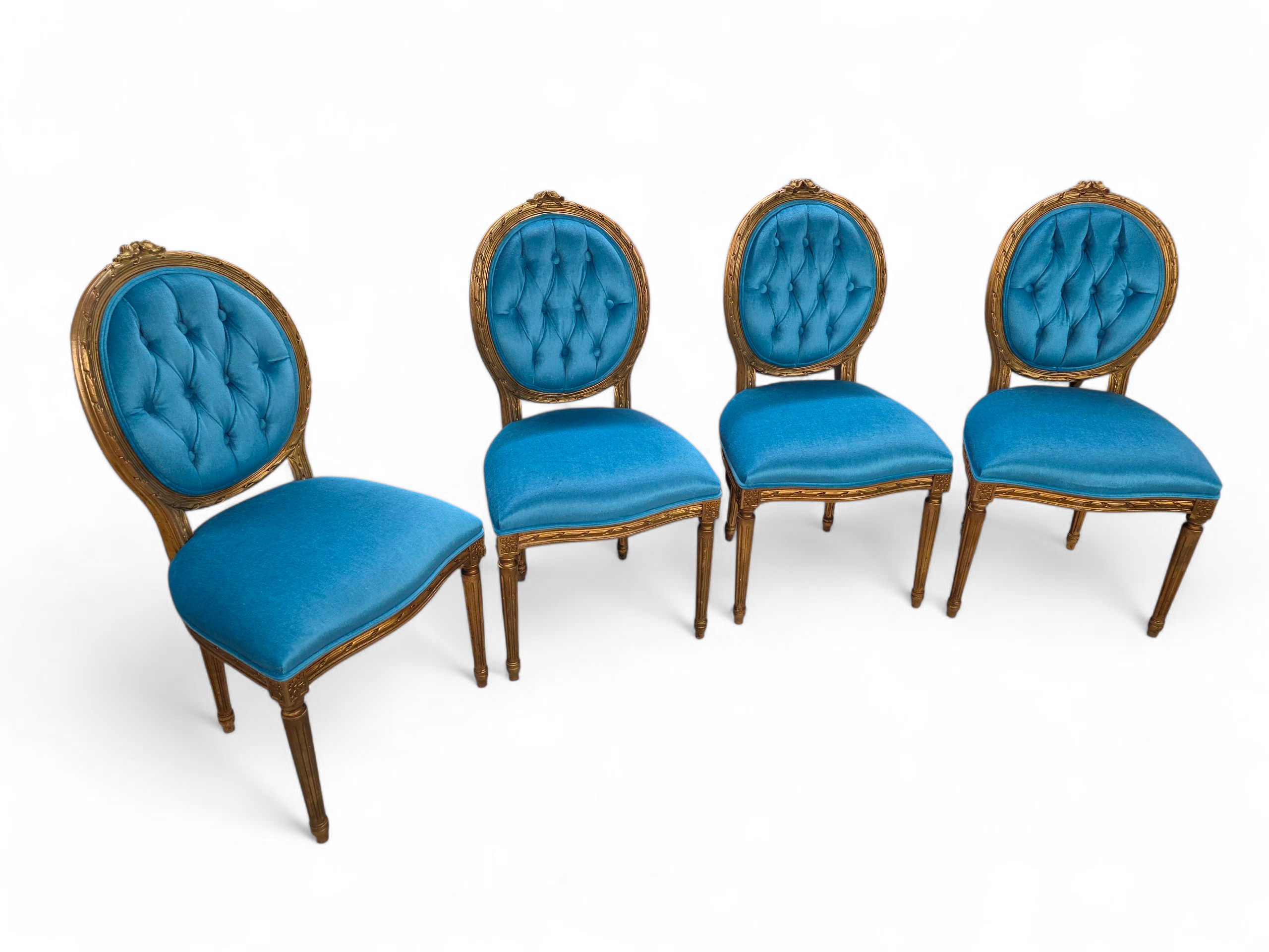 Antique French Louis XVI Style Carved & Gilded Tufted Medallion Back Dining Chairs Newly Reupholstered in a Italian Royal-Teal Mohair - Set of 4