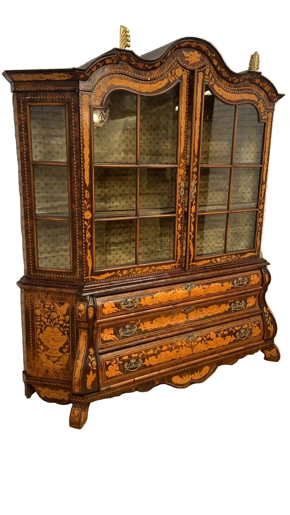 This beautifully crafted piece features intricate floral wood inlay throughout, a serpentine shaped crown, and glazed double doors with side glass panels for display.