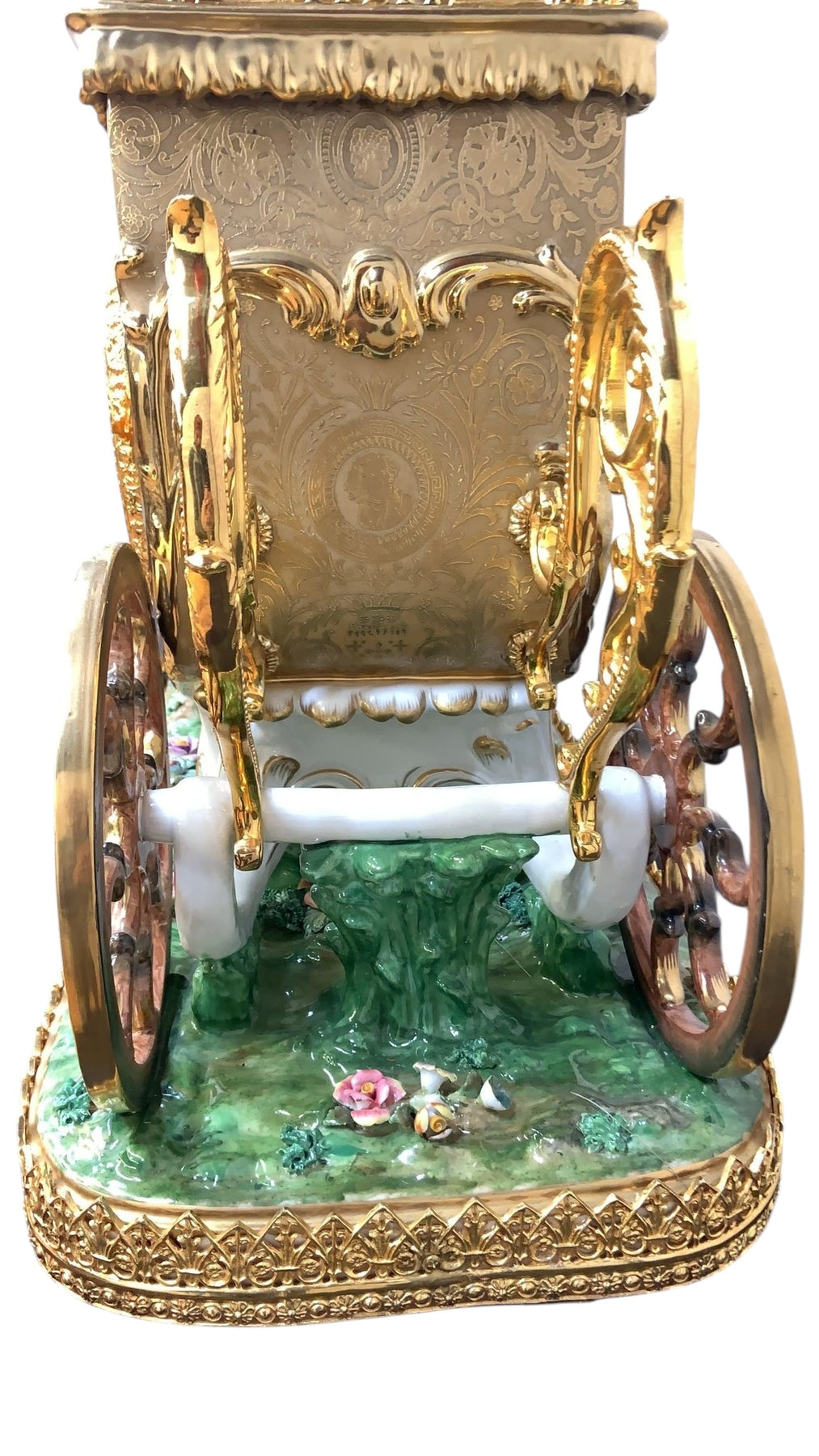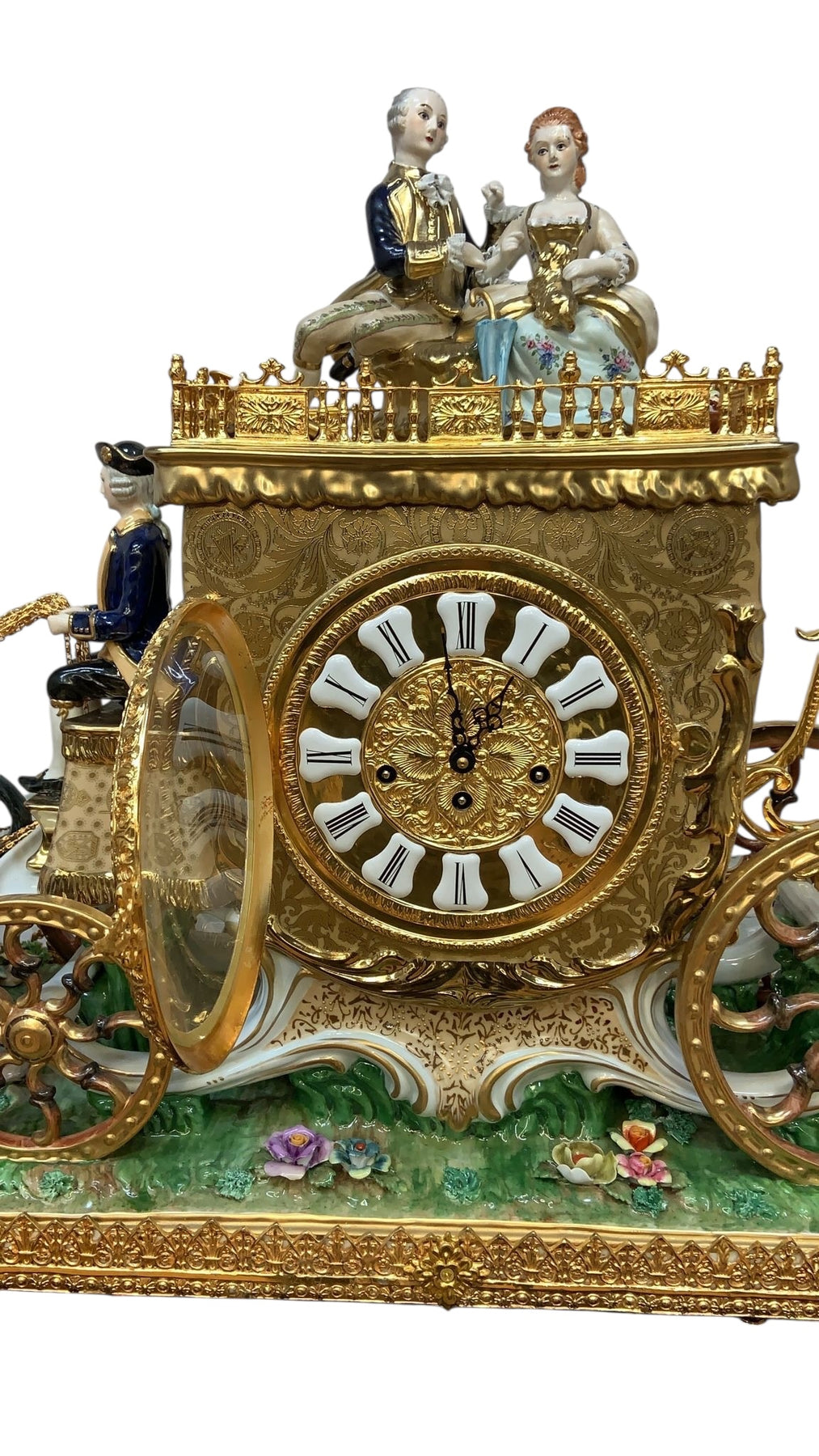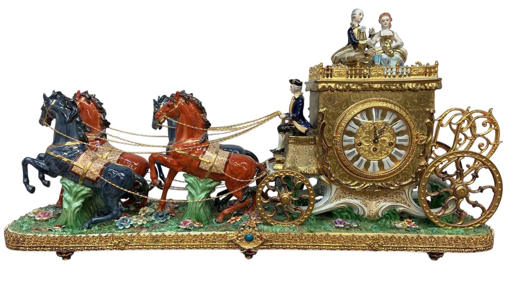 Oversized palace size monumental baroque figural Capodimonte style, finely detailed porcelain antique mantel clock/centerpiece. This piece depicts a baroque wedding carriage drawn by four beautiful and vibrantly colored galloping horses and has profuse gilt embellishment throughout. This piece also features an 18th century style coachman and two lovers atop the carriage with a puppy seated upon the woman's lap. Presented on a finely detailed glass and porcelain base with a gilt bronze surround on ornate gilt embellished feet.