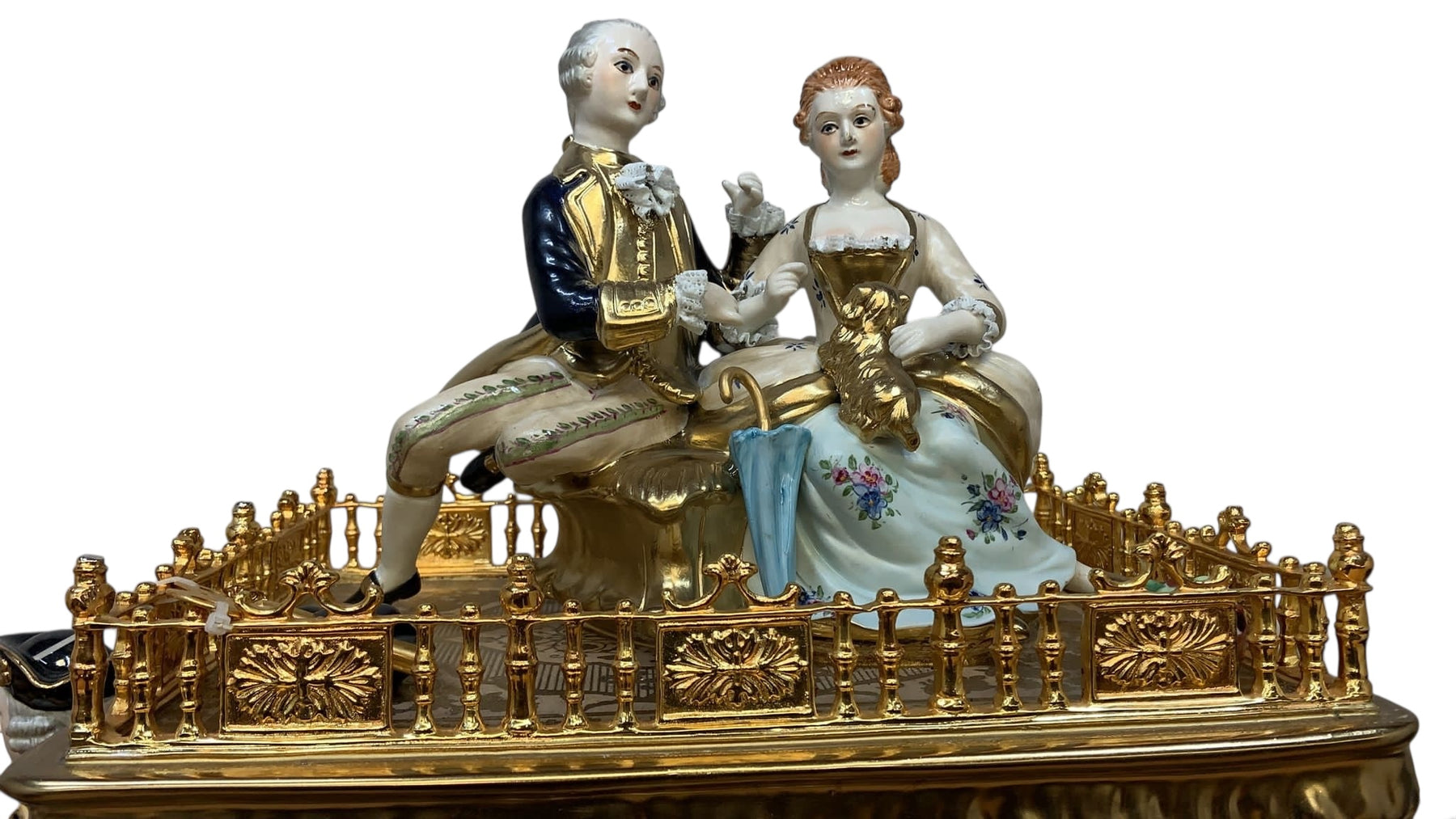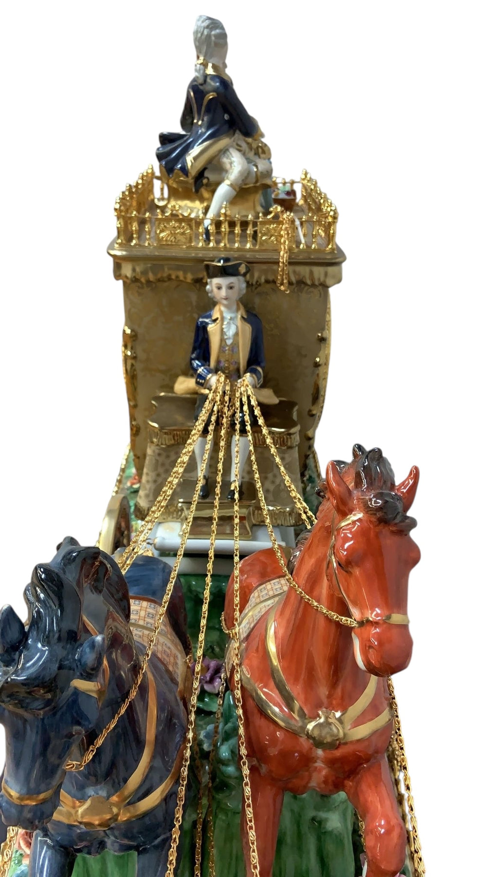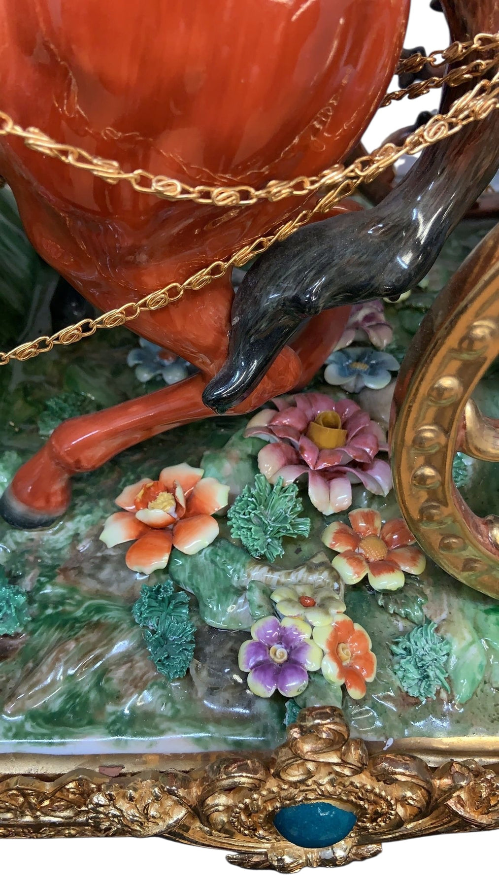 Oversized palace size monumental baroque figural Capodimonte style, finely detailed porcelain antique mantel clock/centerpiece. This piece depicts a baroque wedding carriage drawn by four beautiful and vibrantly colored galloping horses and has profuse gilt embellishment throughout. This piece also features an 18th century style coachman and two lovers atop the carriage with a puppy seated upon the woman's lap. Presented on a finely detailed glass and porcelain base with a gilt bronze surround on ornate gilt embellished feet.