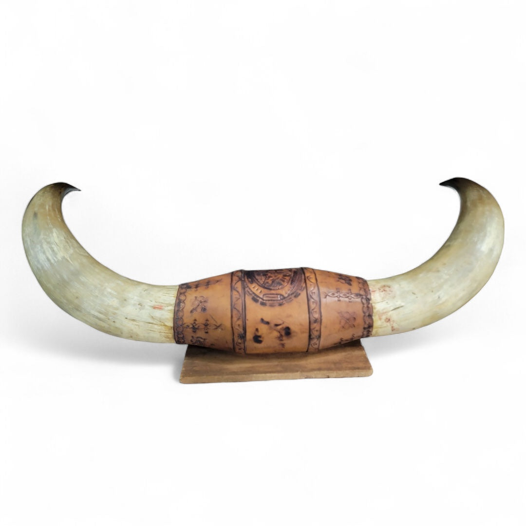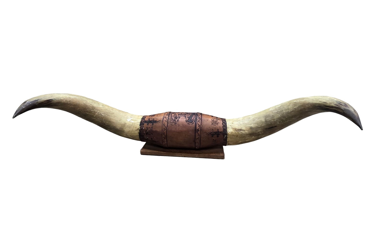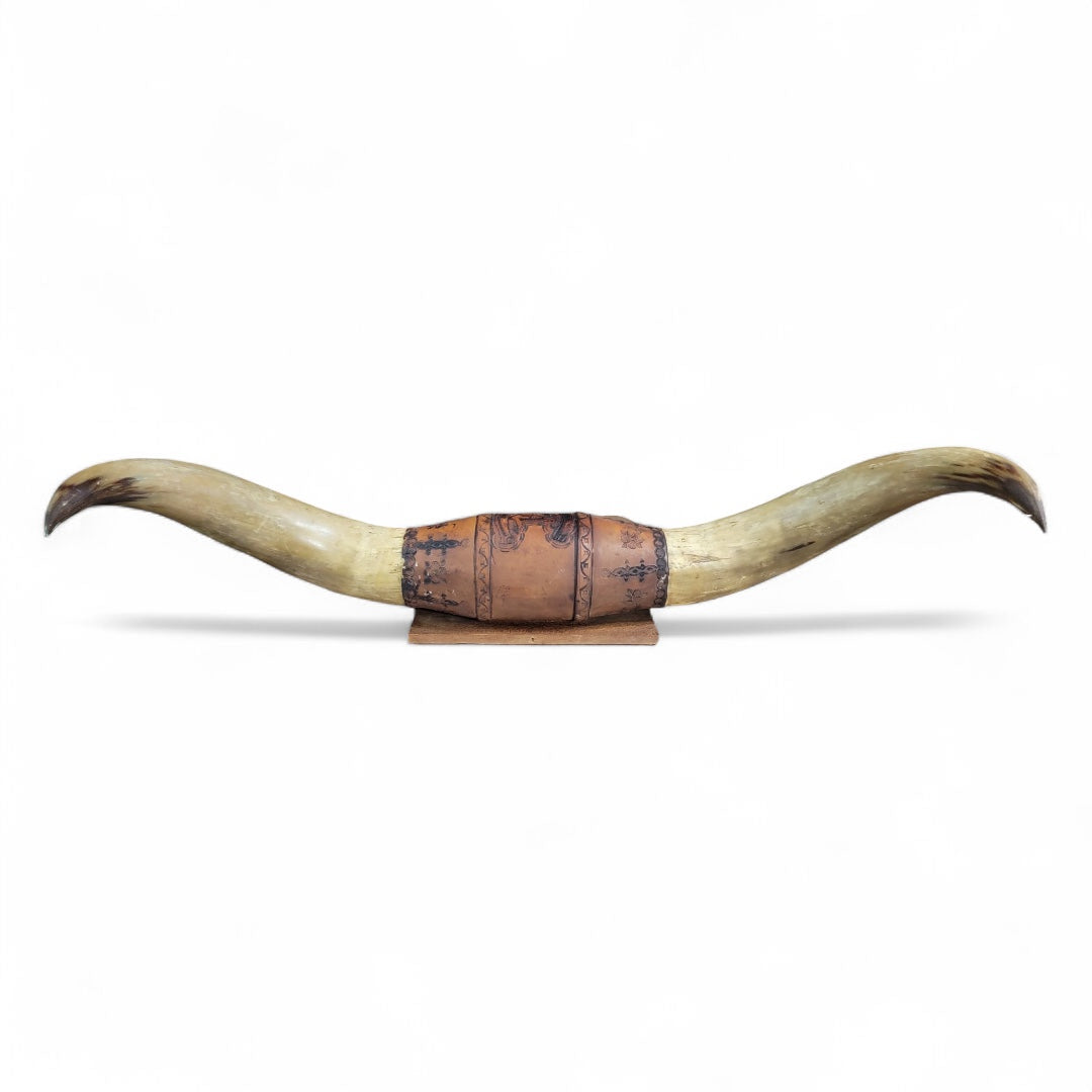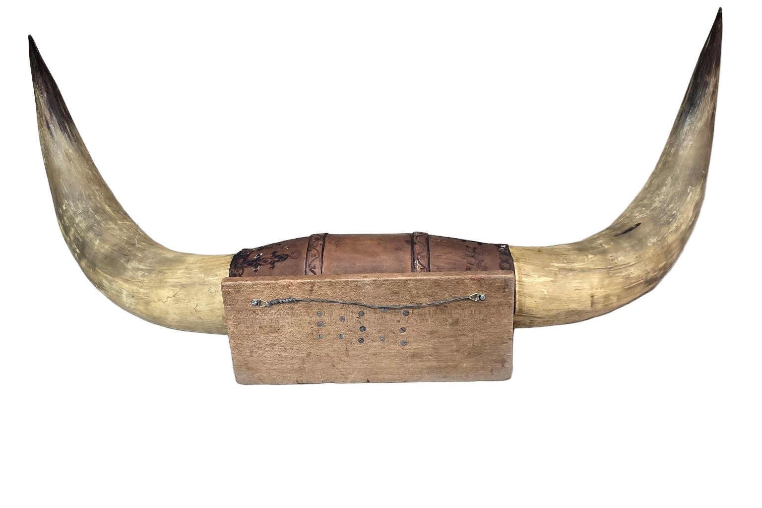 Add a striking piece of American Western history to your collection with this Antique Western Mounted Bull Horns display. Featuring large, curved horns with a natural, aged patina, this piece is joined at the center by tooled leatherand mounted on a flat wooden base for easy display. Popular in the early 1900s, these horns capture the rugged spirit of the frontier and make a bold statement in any rustic, ranch, or Western-inspired home décor.