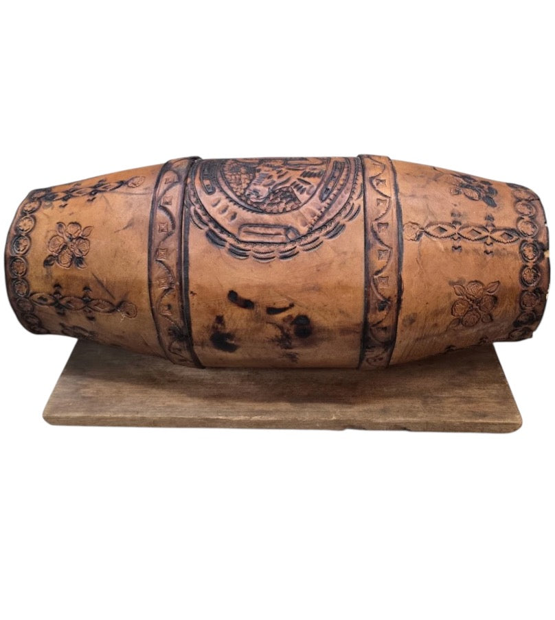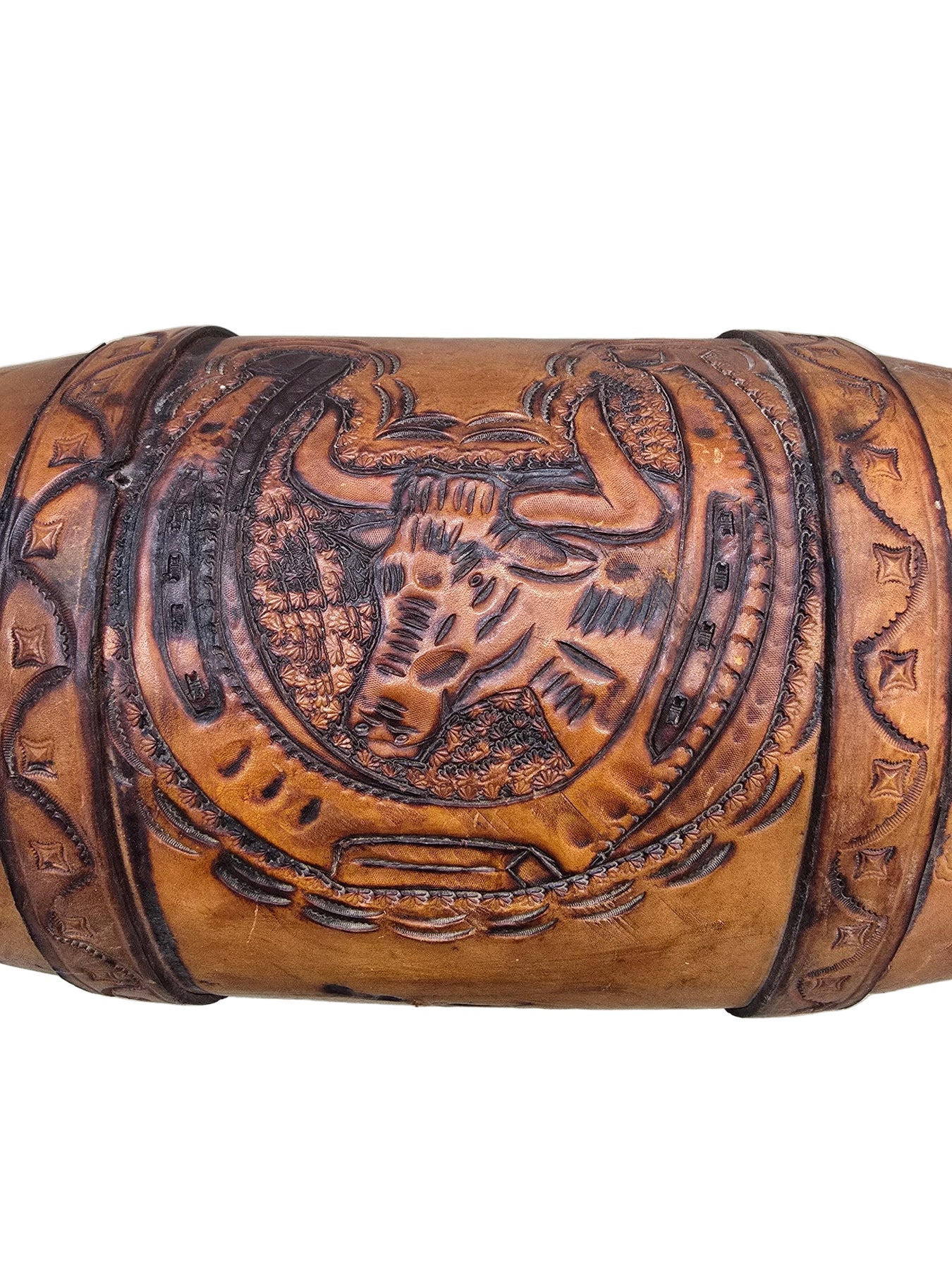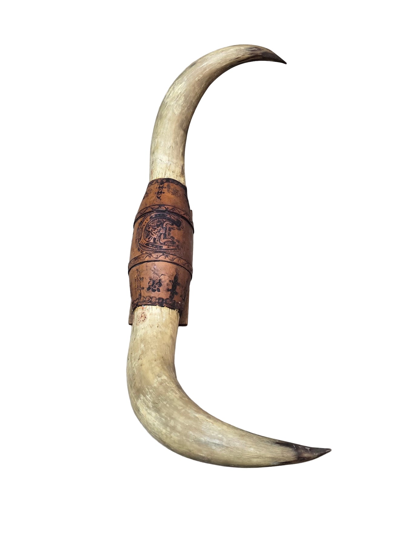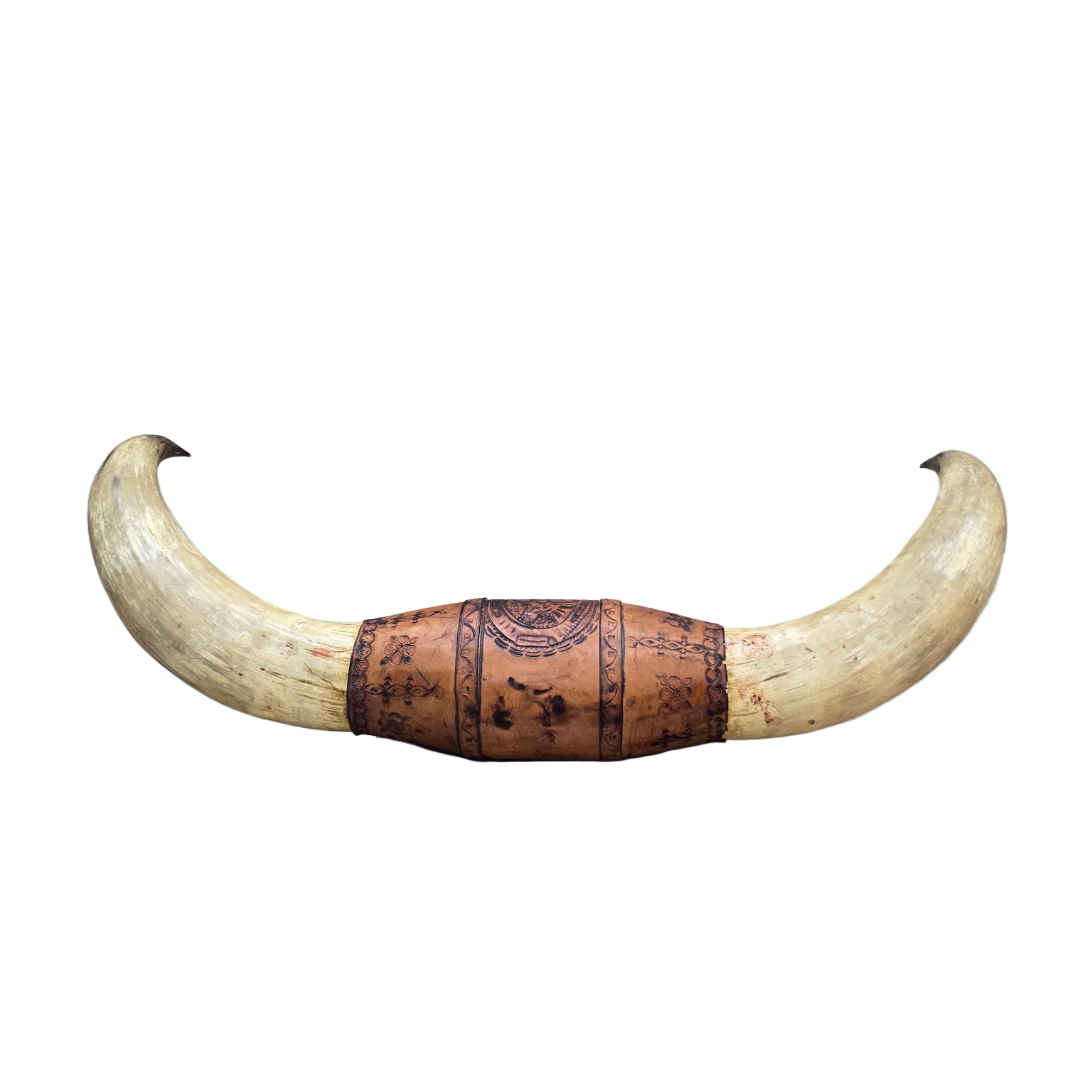 Add a striking piece of American Western history to your collection with this Antique Western Mounted Bull Horns display. Featuring large, curved horns with a natural, aged patina, this piece is joined at the center by tooled leatherand mounted on a flat wooden base for easy display. Popular in the early 1900s, these horns capture the rugged spirit of the frontier and make a bold statement in any rustic, ranch, or Western-inspired home décor.