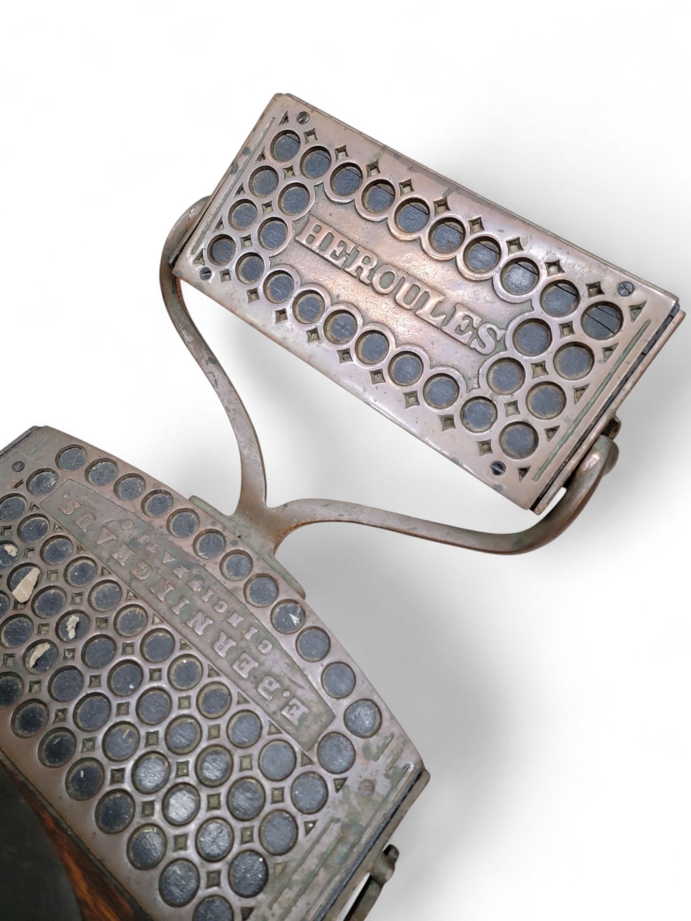 Antique Berninghaus “Hercules” barber and shave chair featuring a solid oak frame, black leather upholstery, and classic early 20th-century American craftsmanship. Known for its bold presence and durable construction, this highly collectible chair makes a striking statement in a barbershop, loft, retail display, or industrial-inspired interior.
