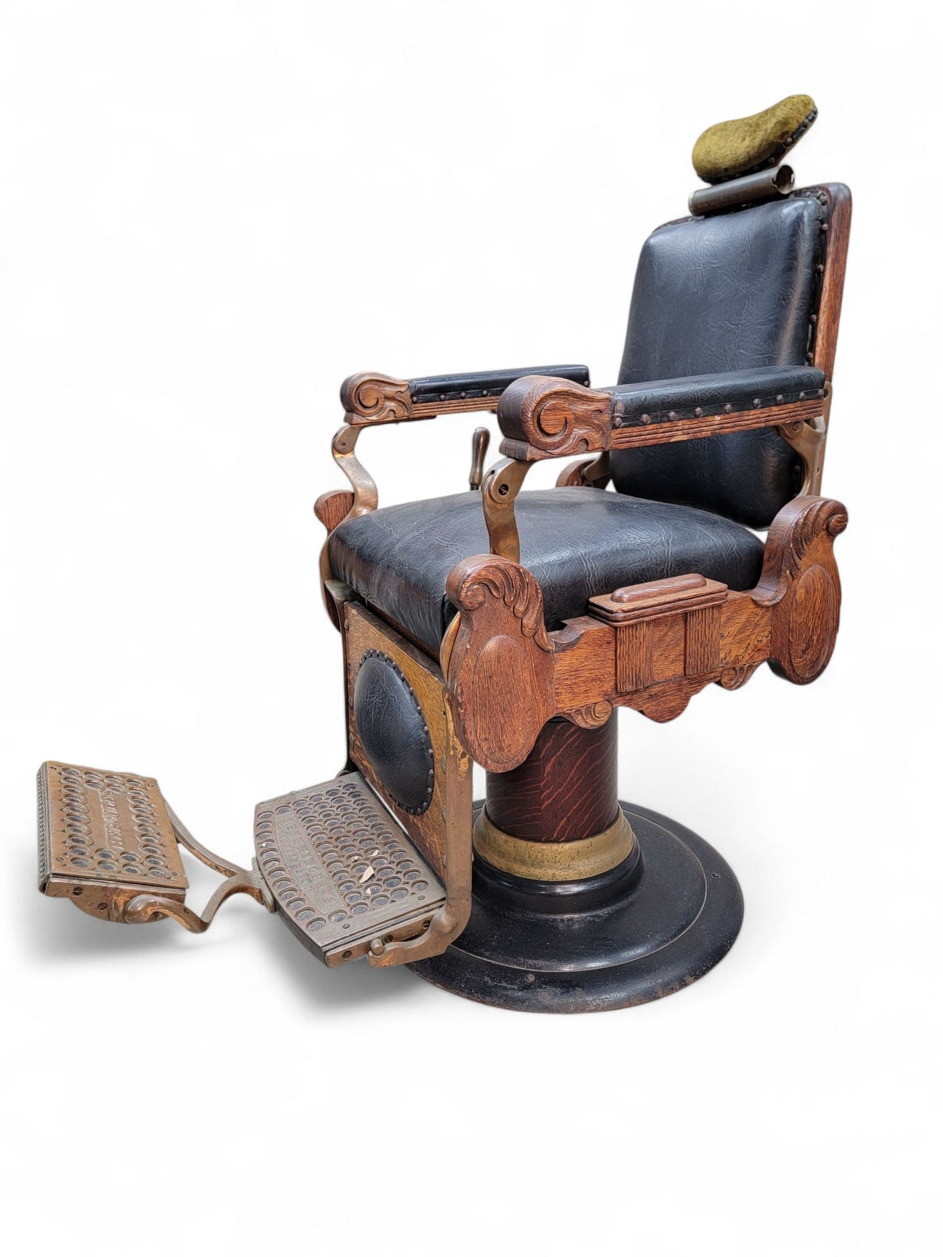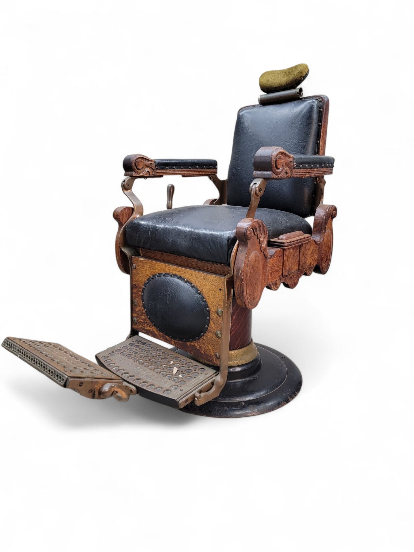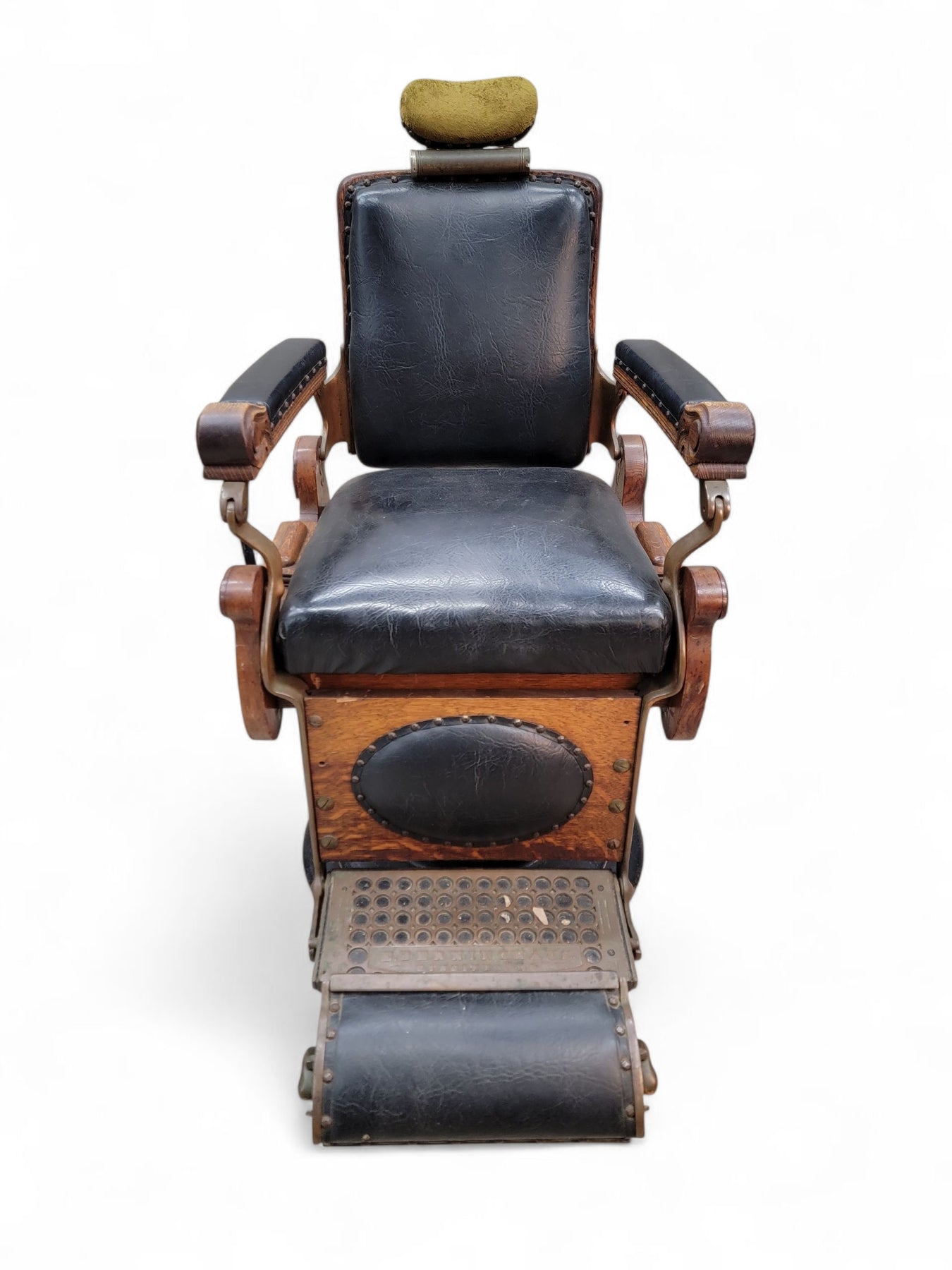 Antique Berninghaus “Hercules” Barber & Shave Chair with Oak Frame & Black Leather