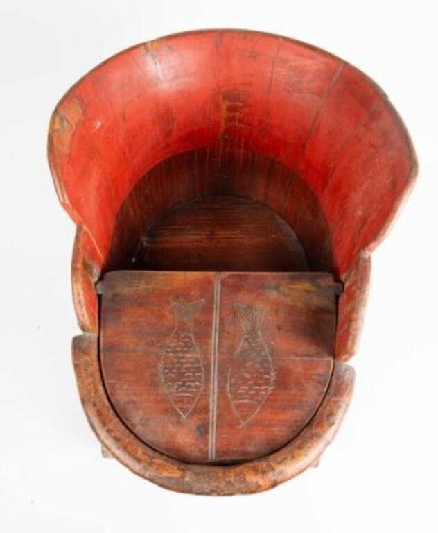 The piece displays wonderful surface character developed over time, with deep red tones and natural wear consistent with age. Both sculptural and functional, it serves beautifully as a decorative object, planter, or unique storage piece. A striking and authentic example of Qing-period Chinese folk furniture with strong visual presence.