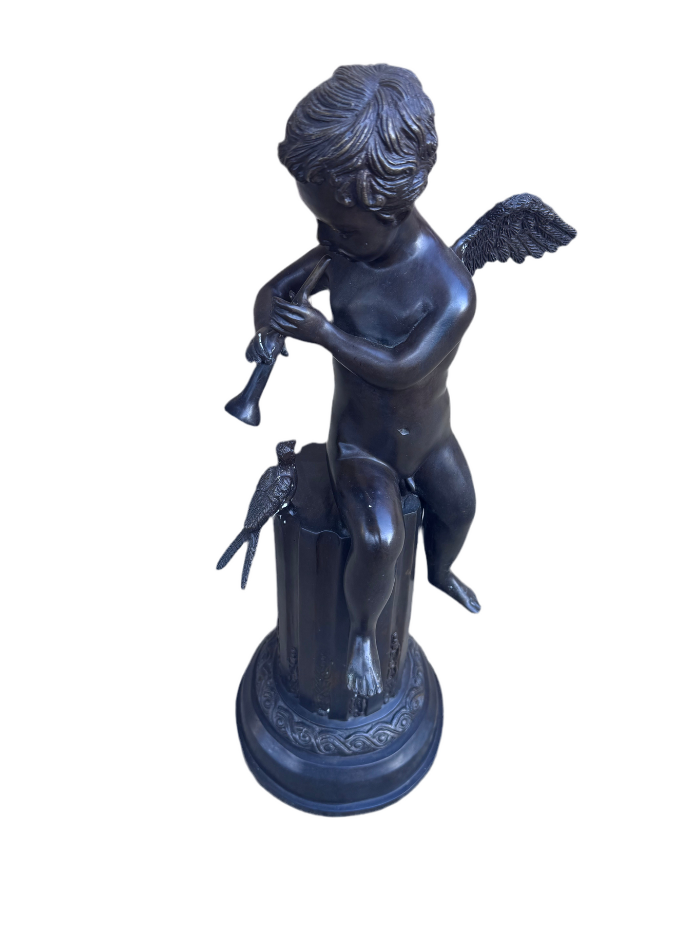 Antique Bronze Cherub on Pedestal Playing The Flute Sculpture Attributed to French Artist Auguste Moreau