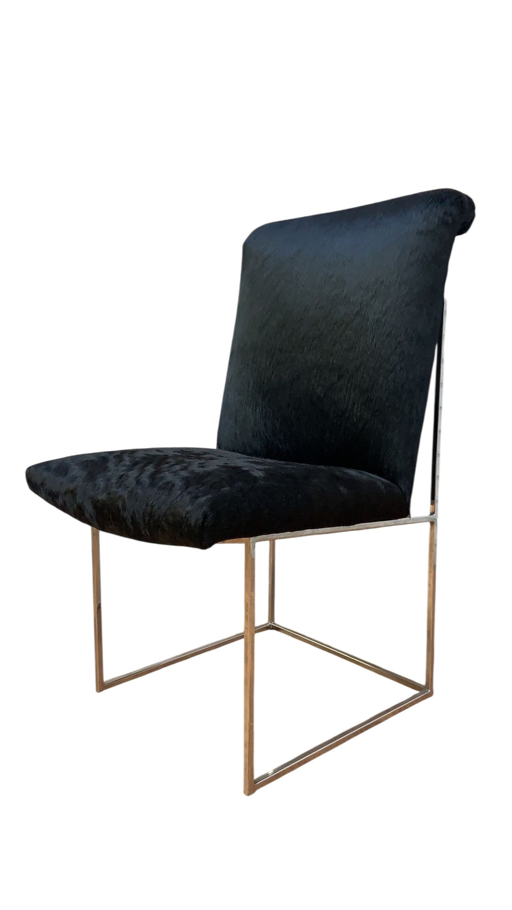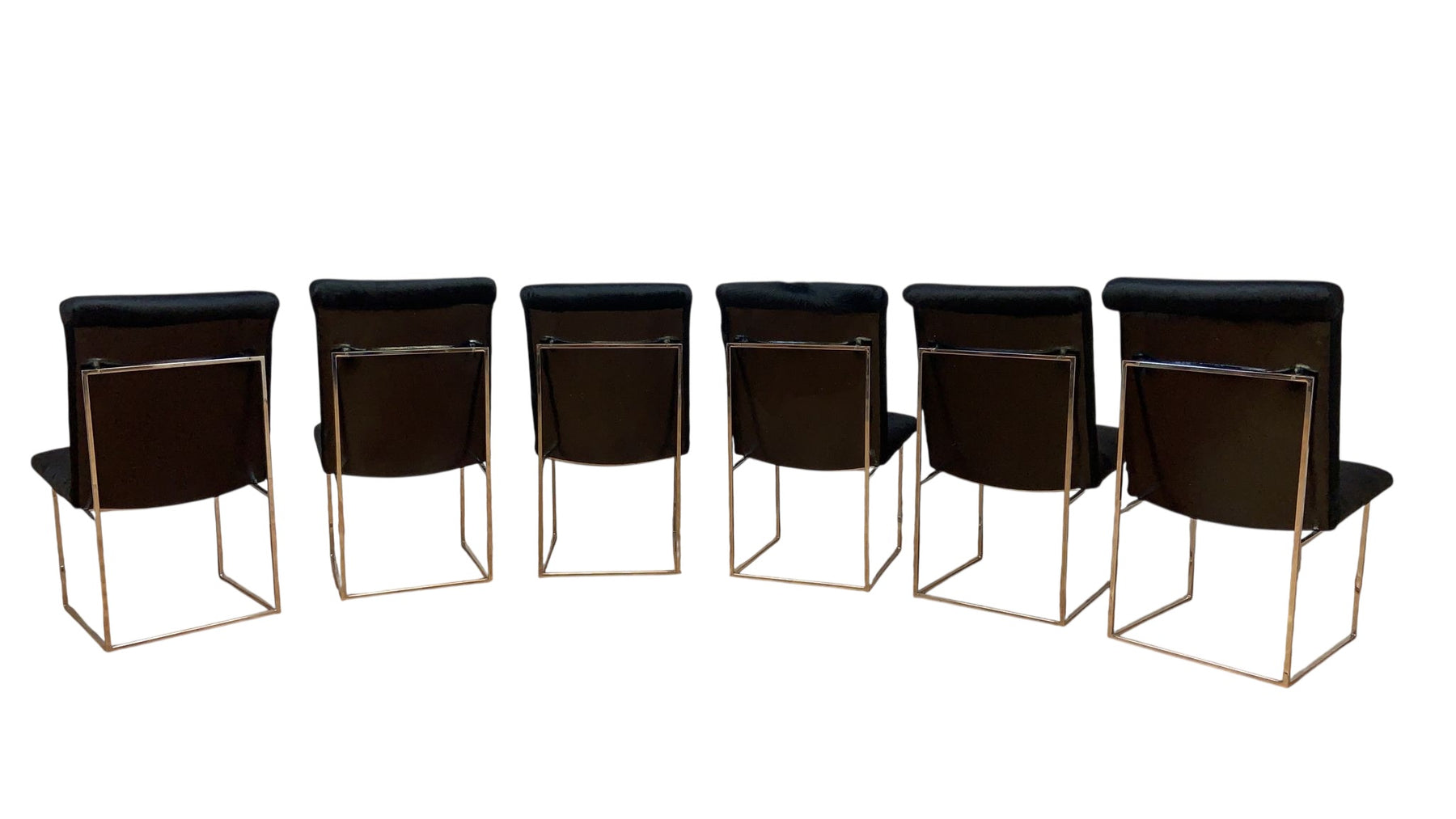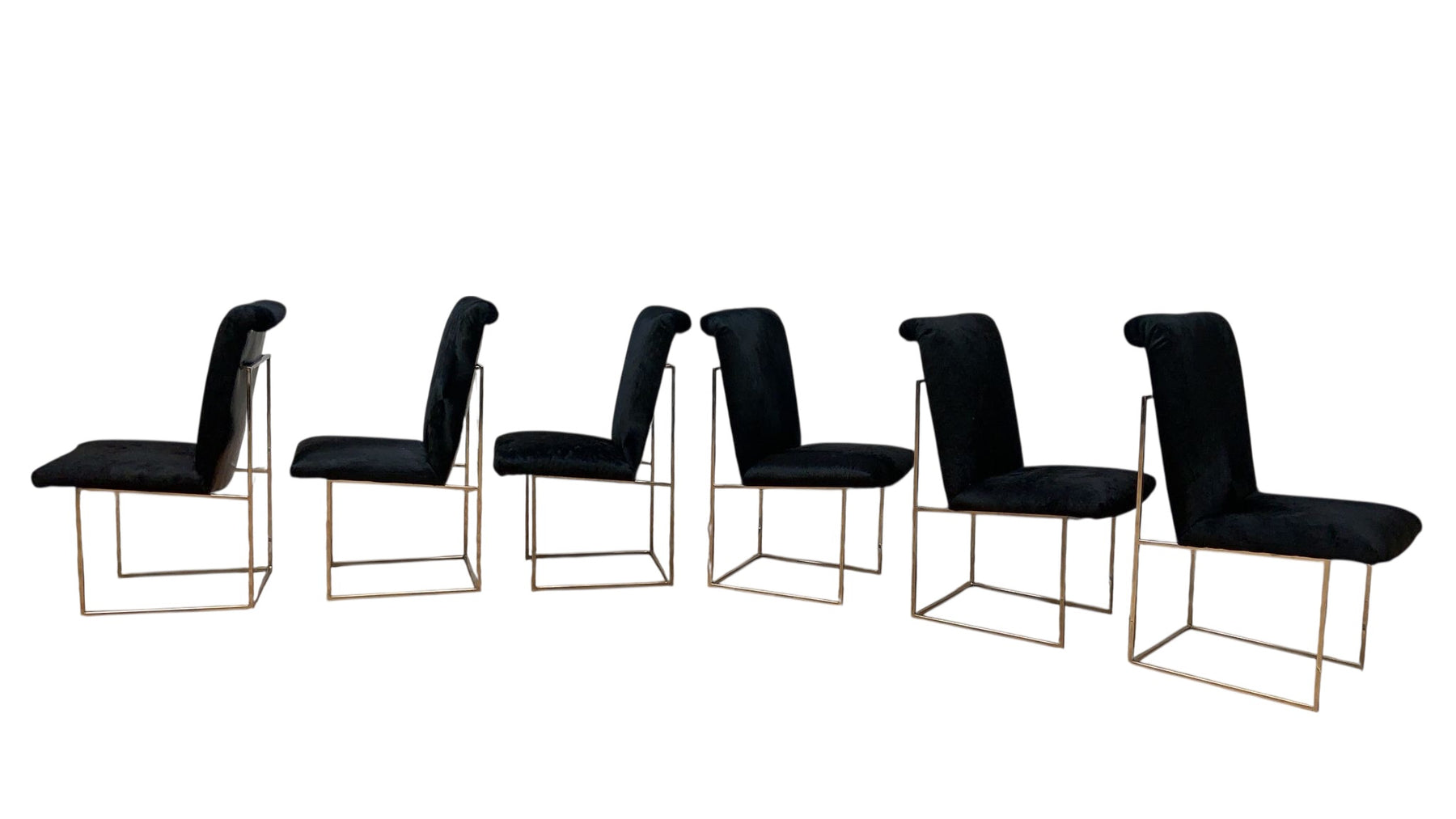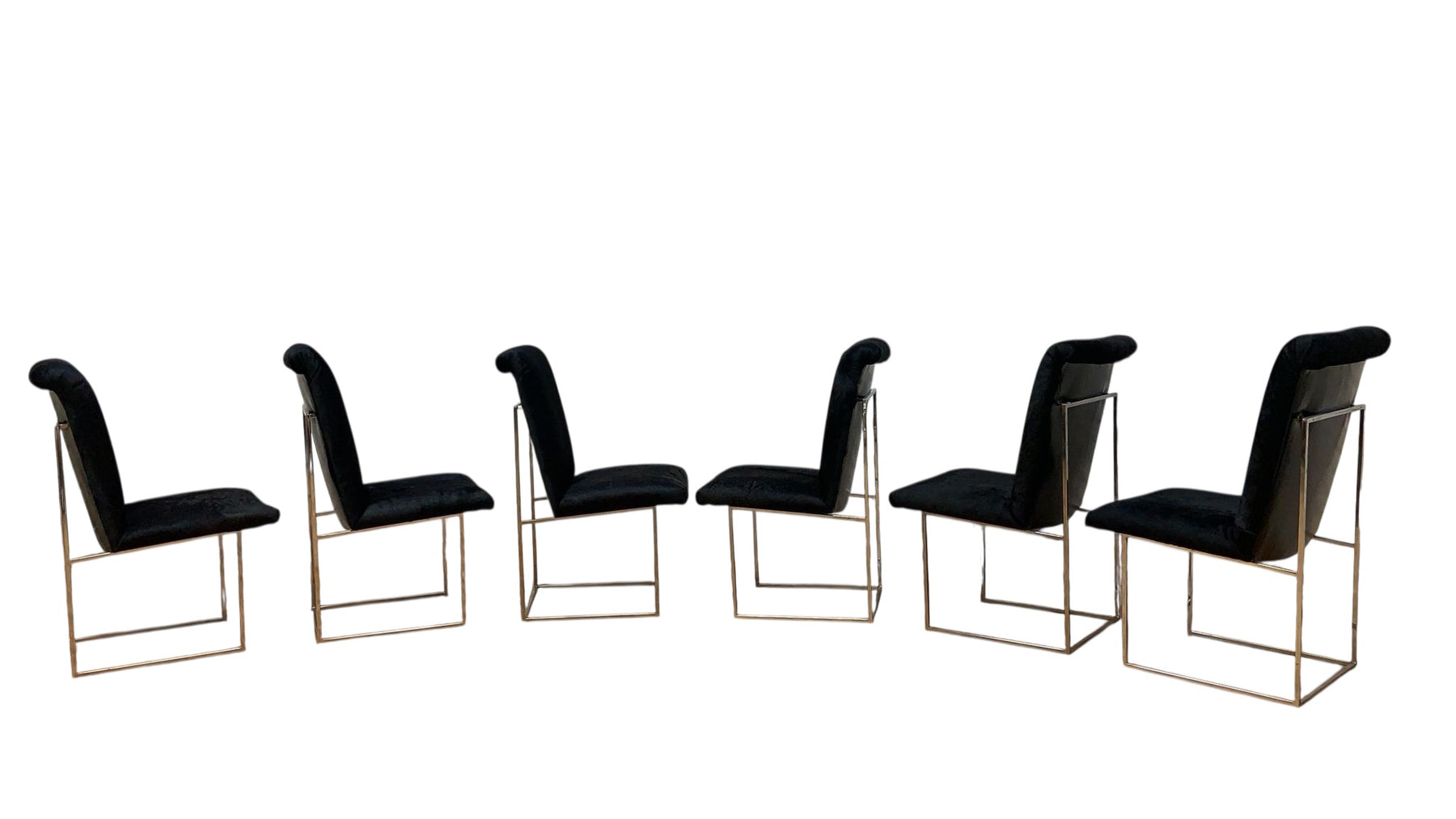 A spectacular set of six vintage chrome “Thin Line” dining chairs designed by Milo Baughman for Thayer Coggin in the United States, circa 1970s. The seats appear to be floating mid-air as they lie above an architectural chrome frame. The details on these chairs reflect the expert craftsmanship put into making this design. We are sure that these chairs will give your space a unique touch, offering a vintage and modern atmosphere in your home. Newly reupholstered in a luxurious custom fabric.