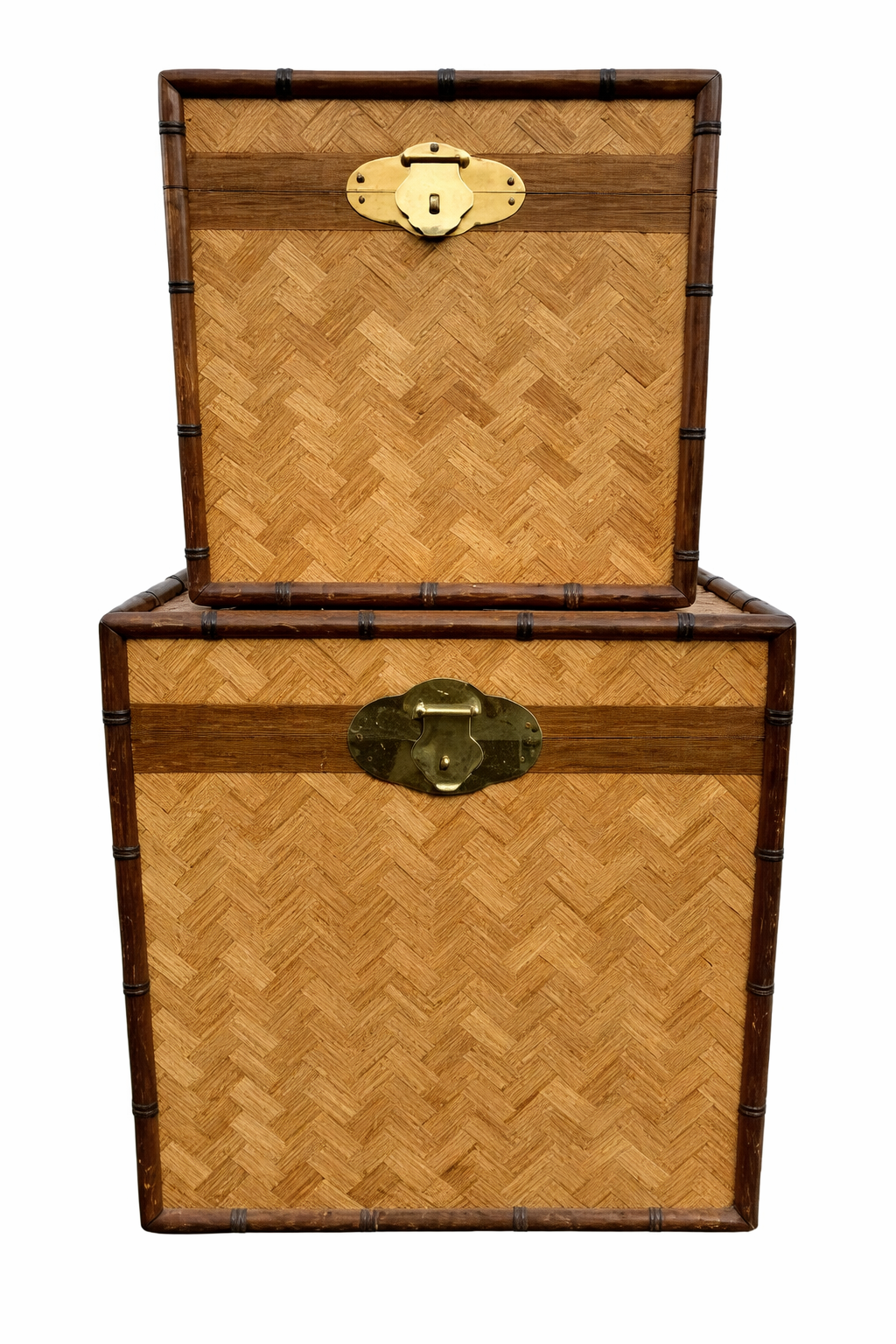 Vintage Set of Woven Asian Style Bamboo Nesting Storage Trunks with Antique Brass Hardware.